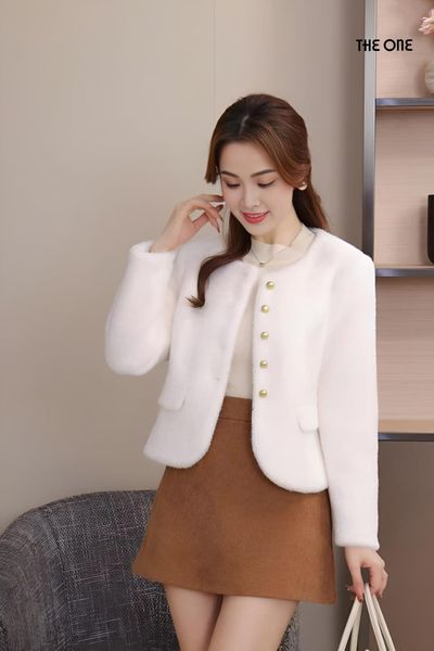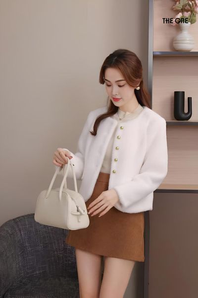 Áo khoác lửng tay dài dạ lông trắng cổ tròn khuy đồng nắp túi