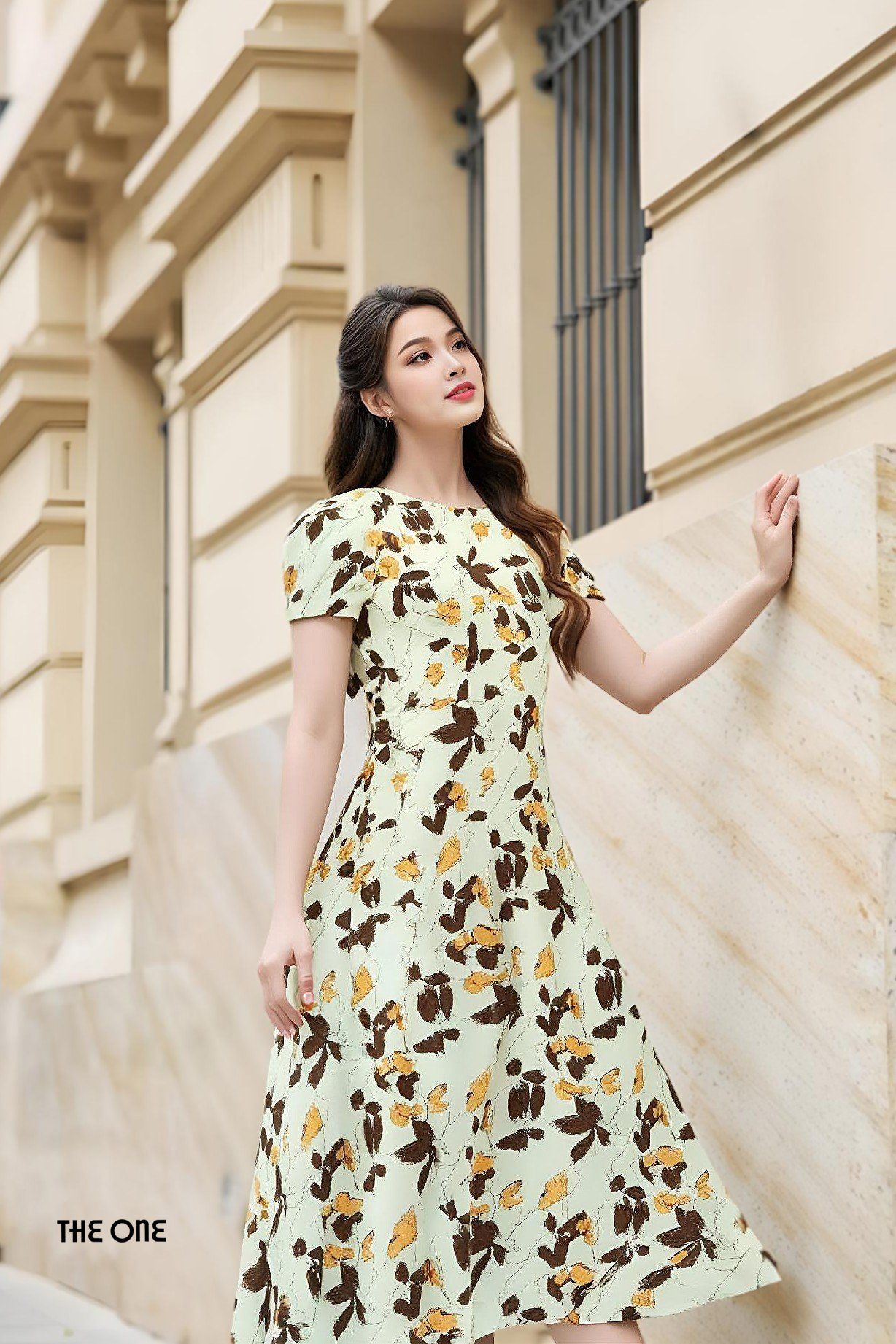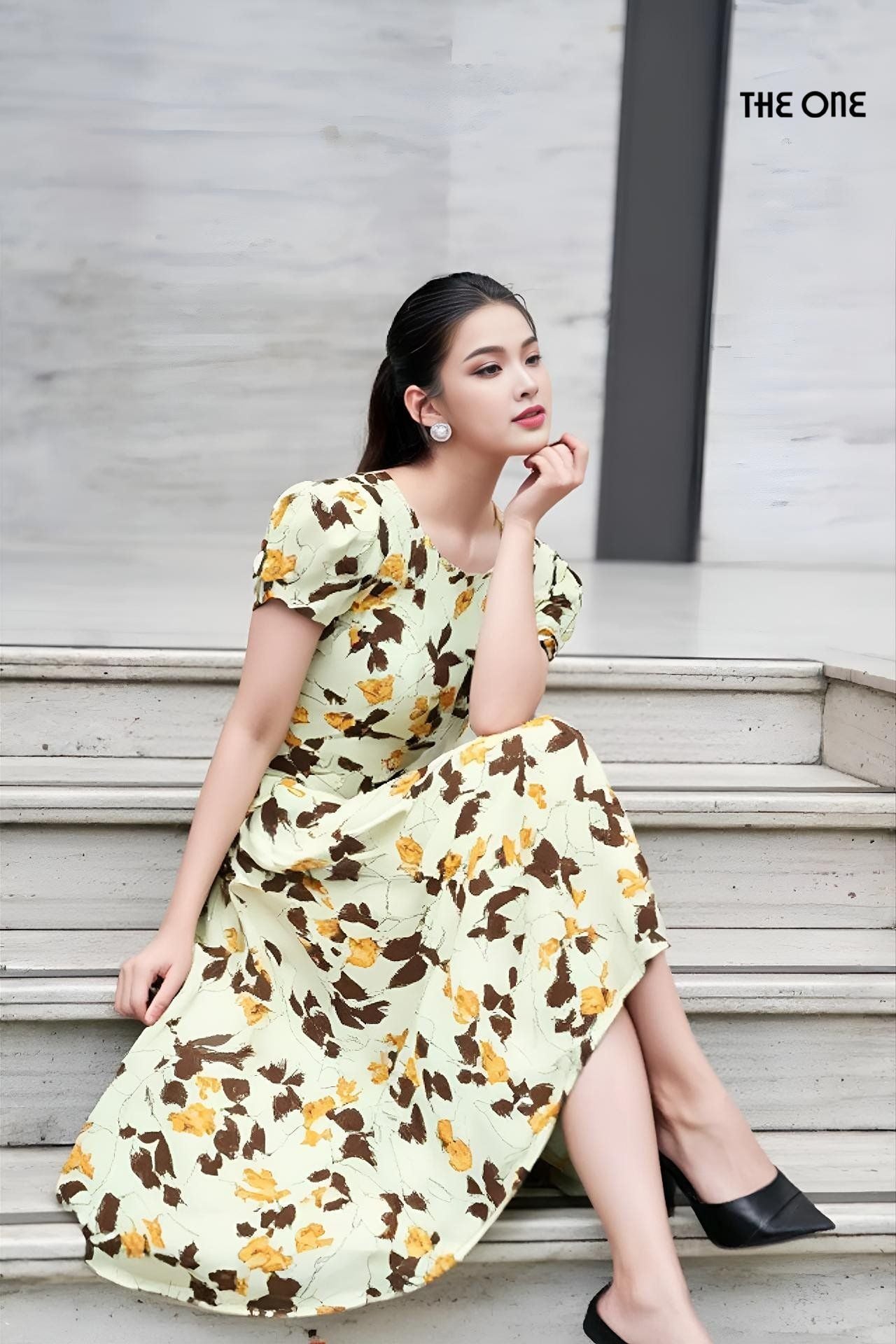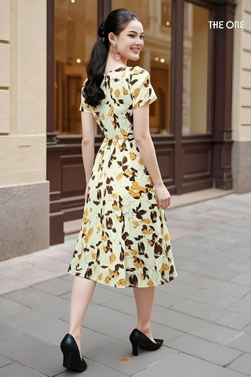 Đầm 2 lớp tay cộc cổ tròn lụa vàng hoa cam nâu vai đính nơ dáng xòe