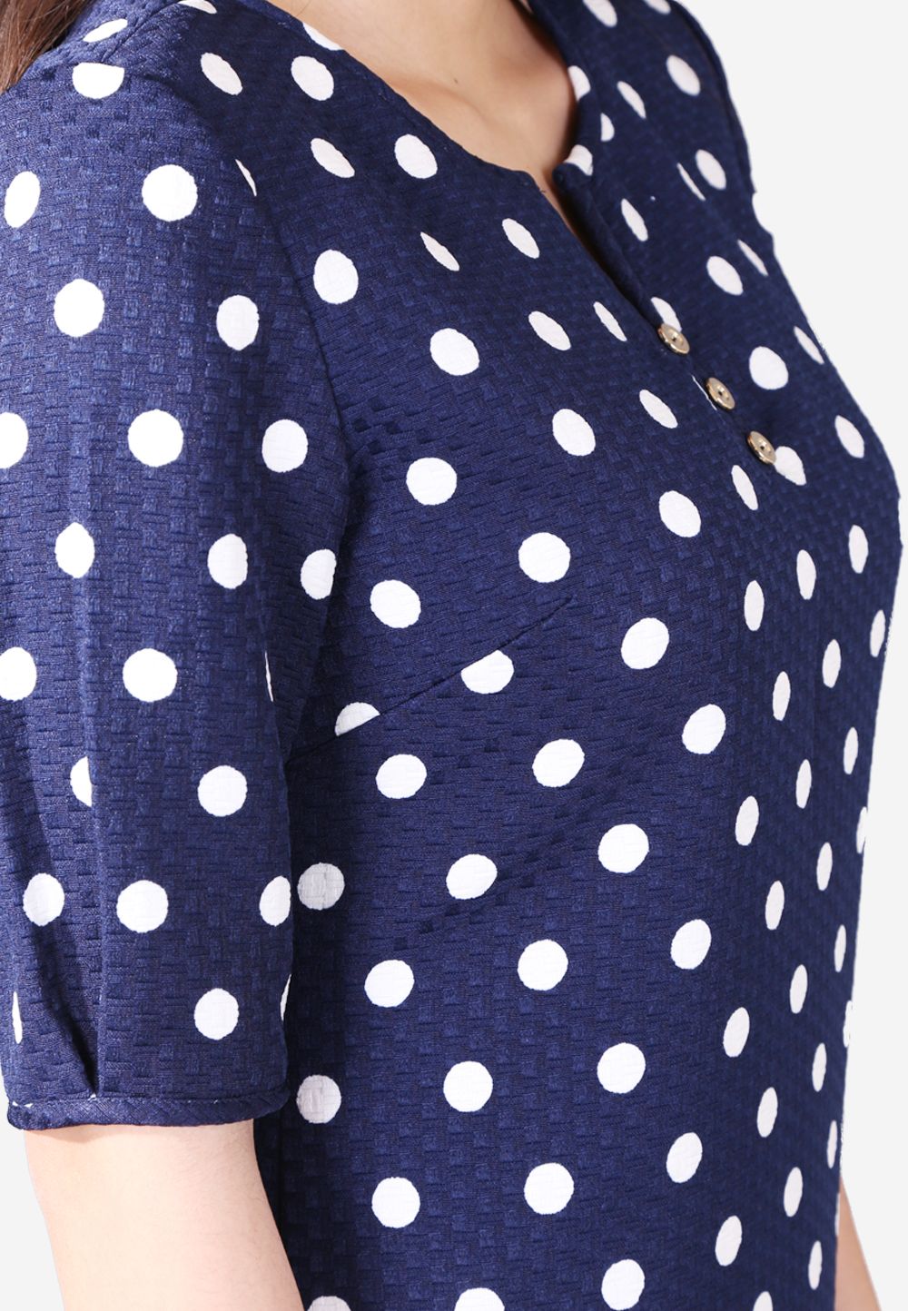Đầm 2 lớp tay lỡ xước thái chấm bi trắng nền tím than dáng suông cổ V khuy ngực