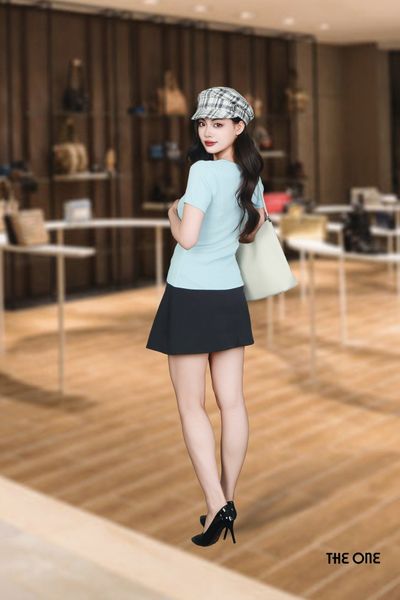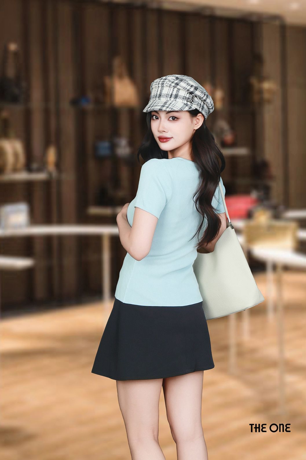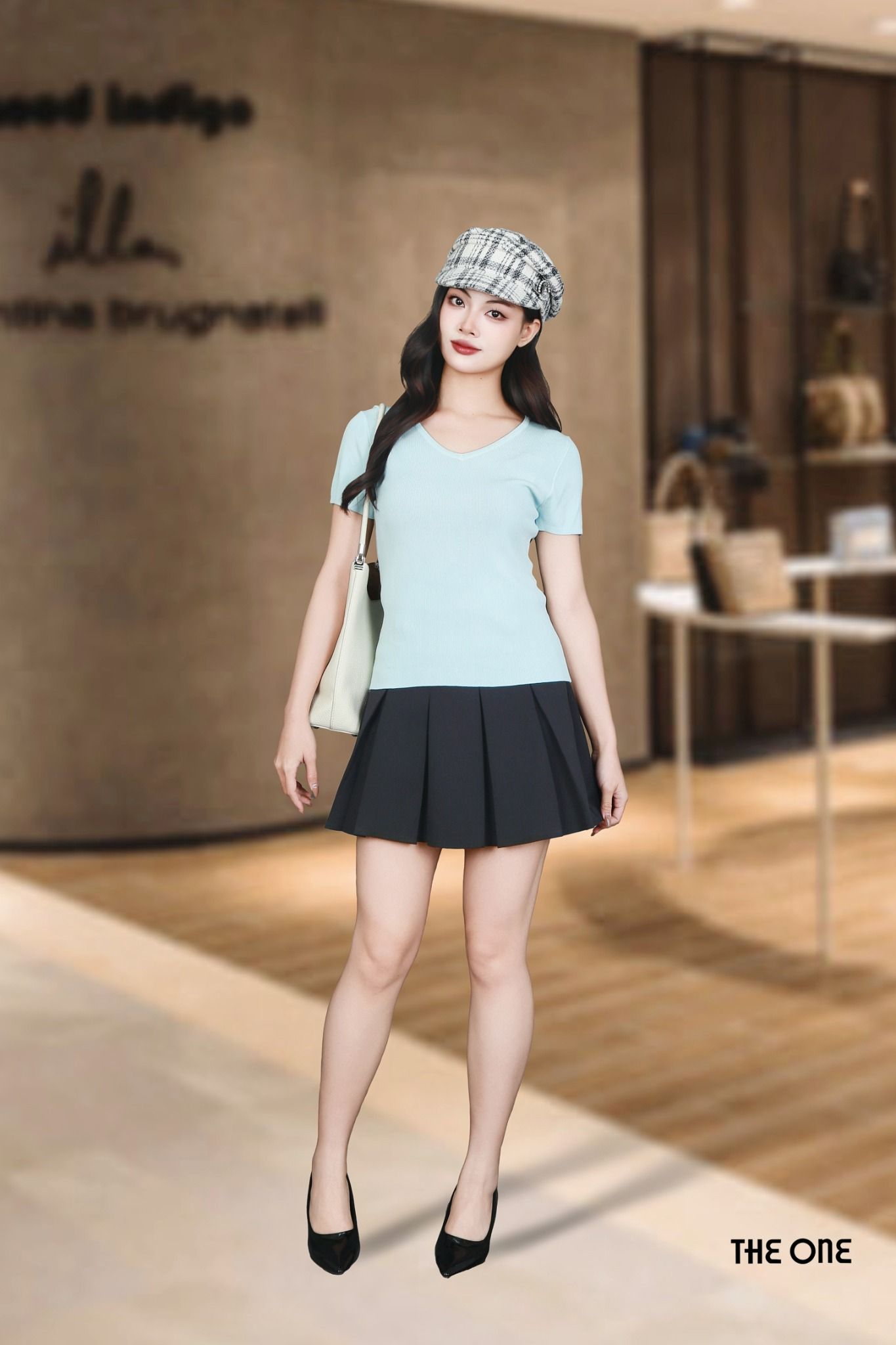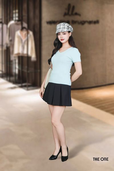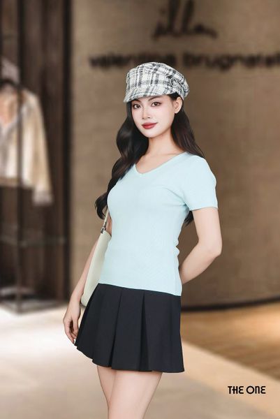 Áo len Mongtoghi xanh nhạt cổ tim tay cộc