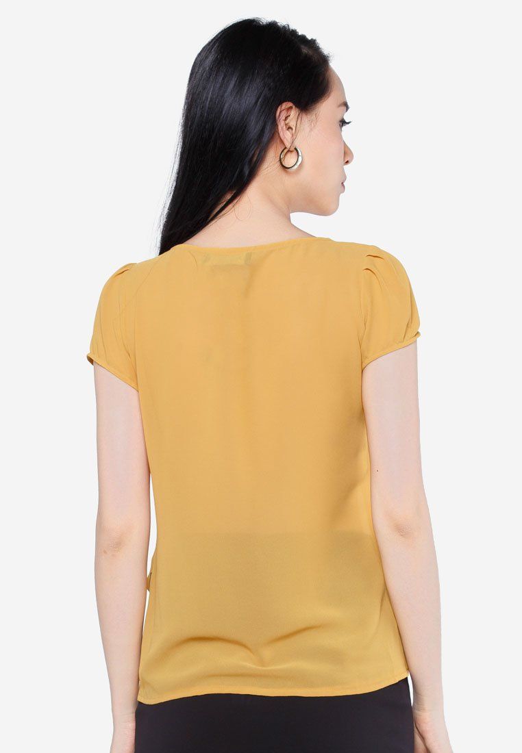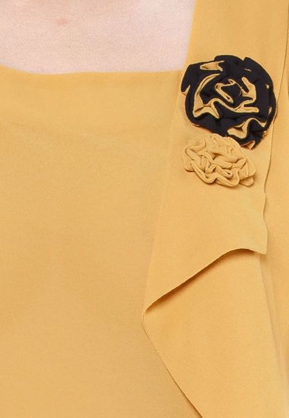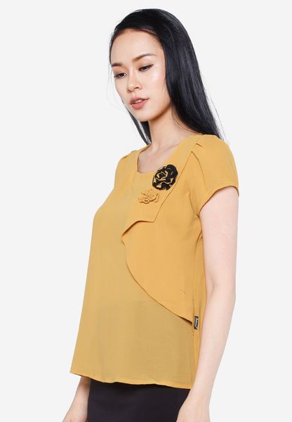 Áo sơ mi chiffon vàng cộc tay cổ lệch vạt ngực đính 2 hoa