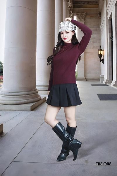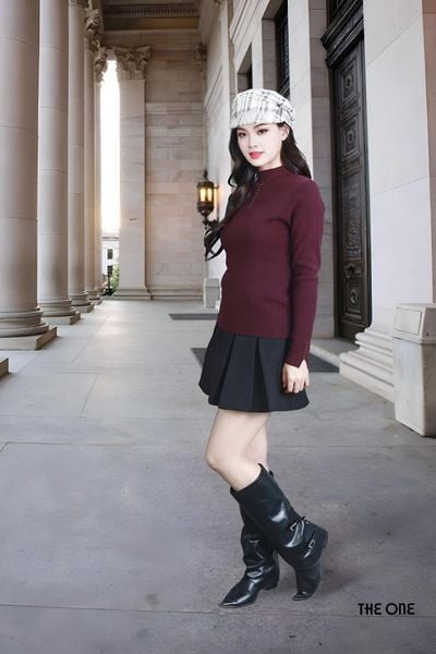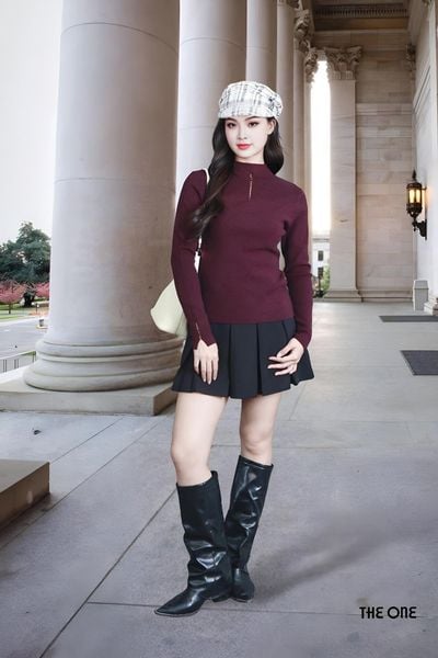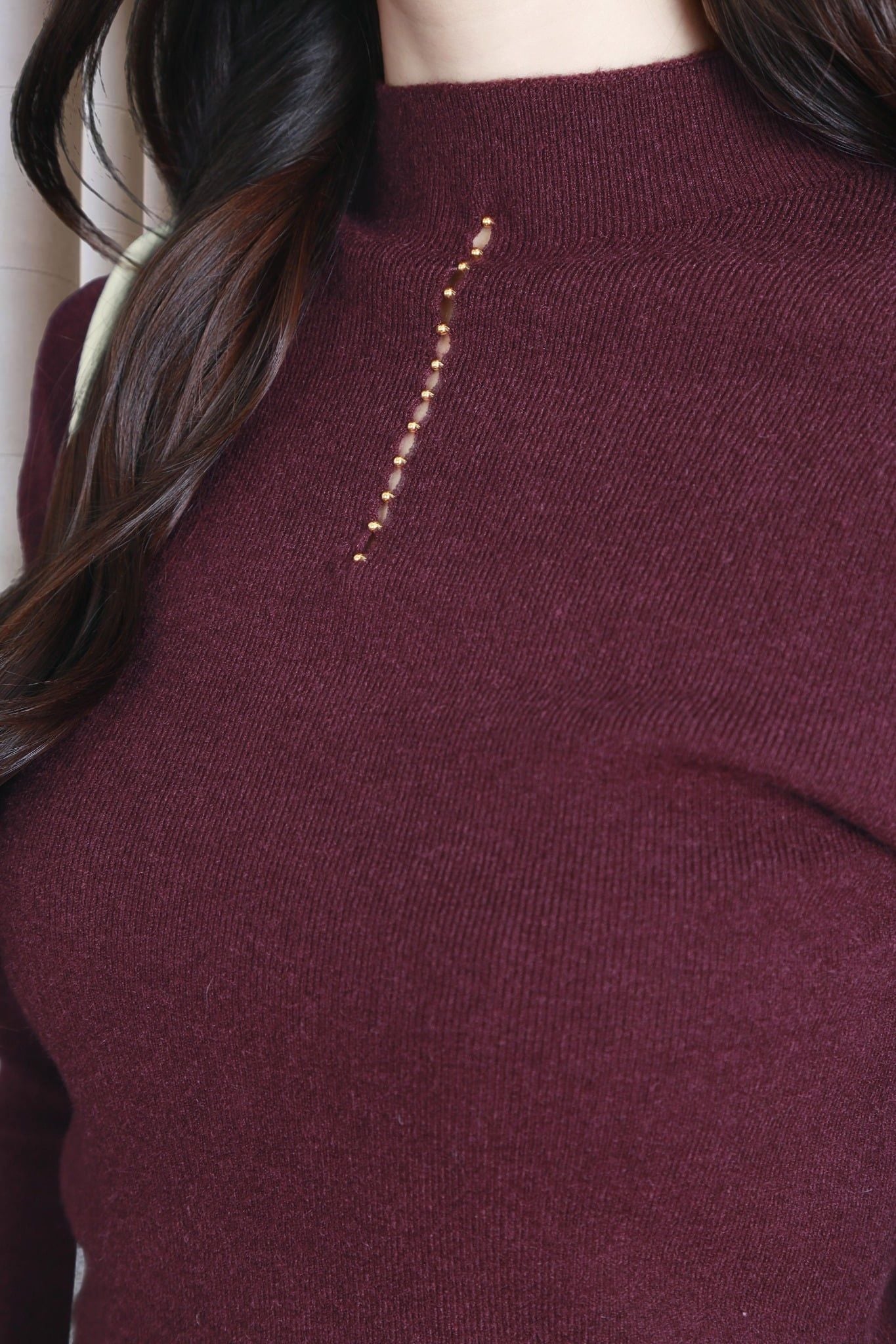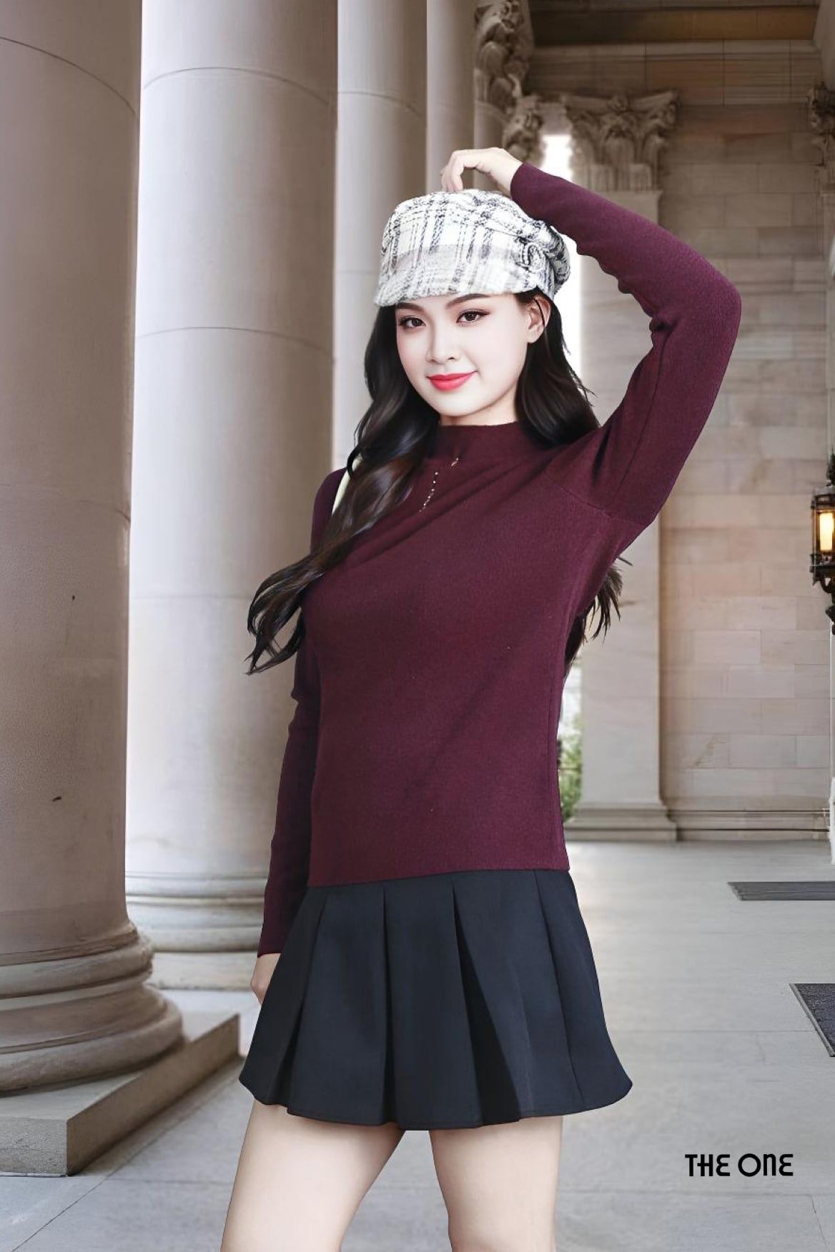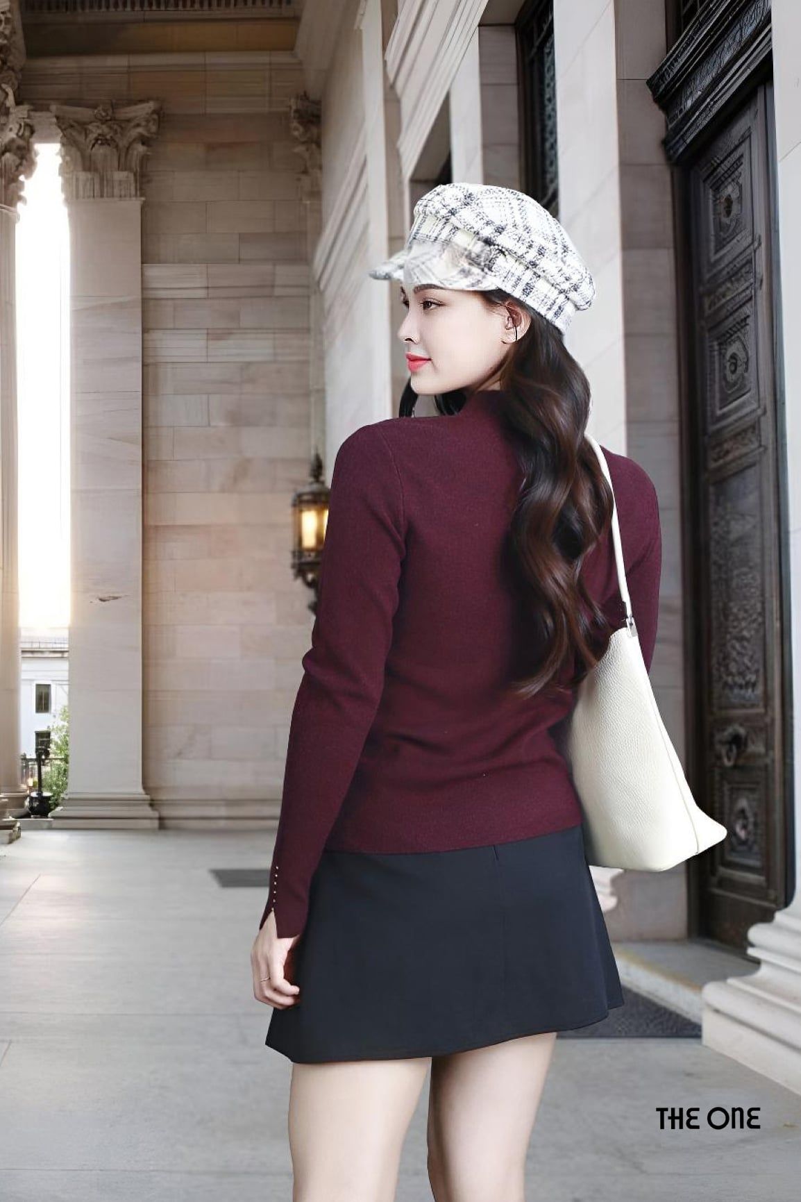 Áo len tím đậm tay dài cổ 3cm khuy dọc cổ và tay