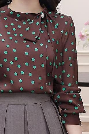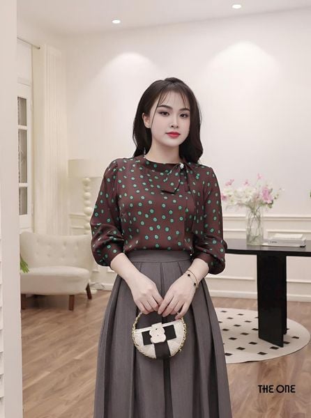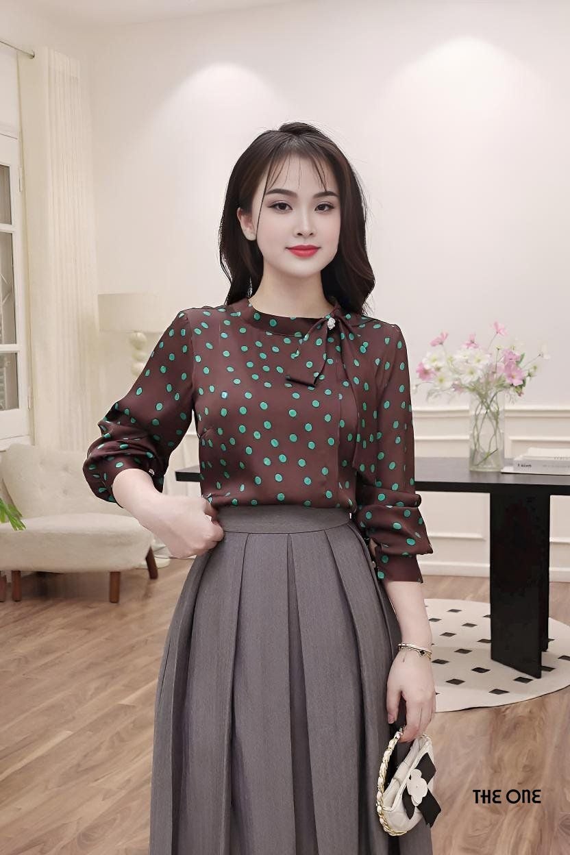 Áo sơ mi tay dài lụa Hàn nền nâu chấm bi xanh cổ cao thắt nơ đính hạt mí thân trước