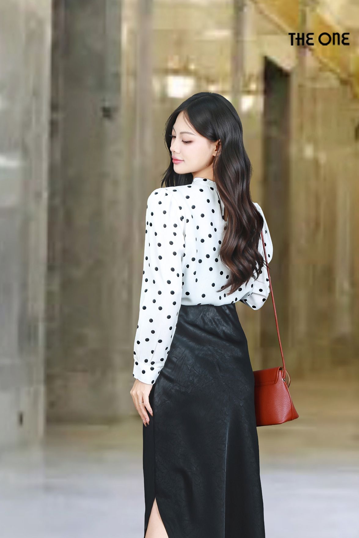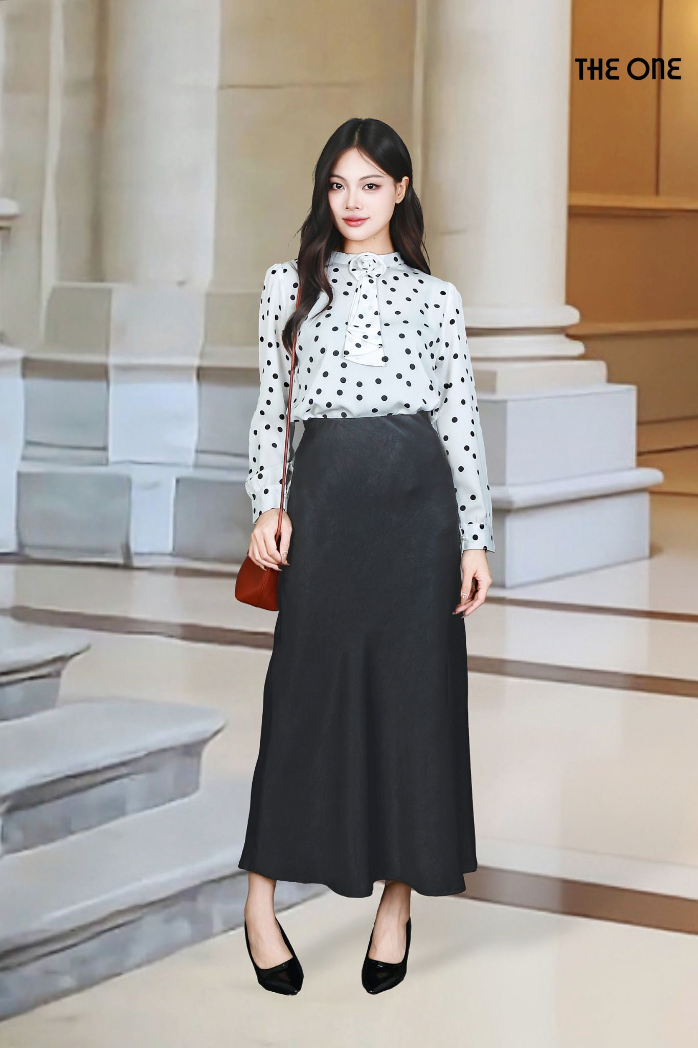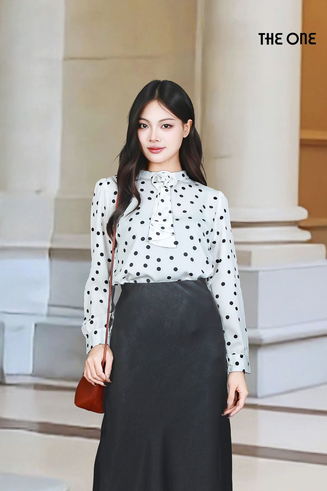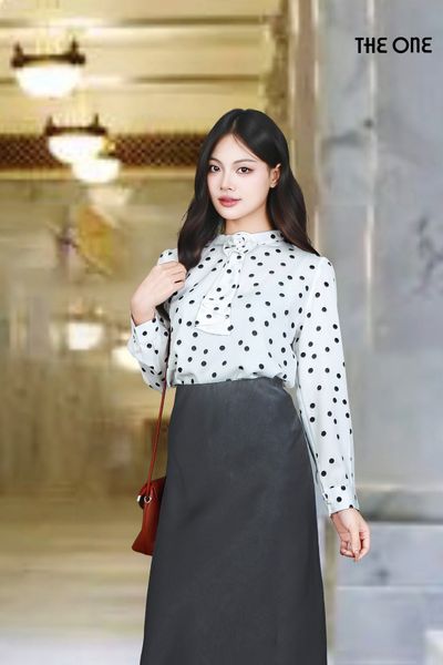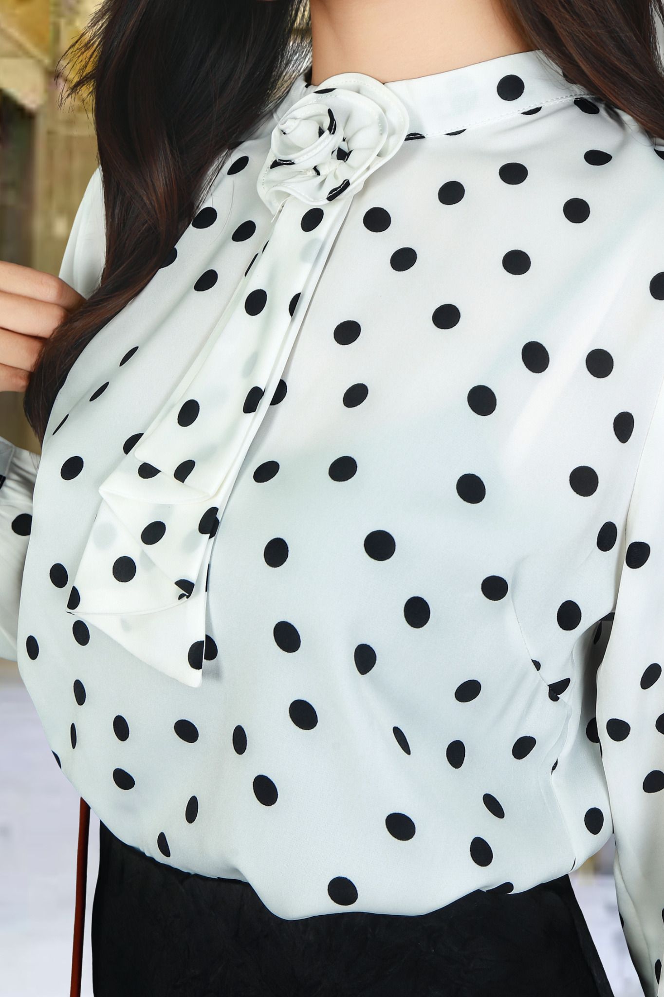 Áo sơ mi tay dài lụa trắng chấm bi đen chân cổ tàu thấp ca vát cổ đính hoa