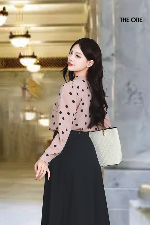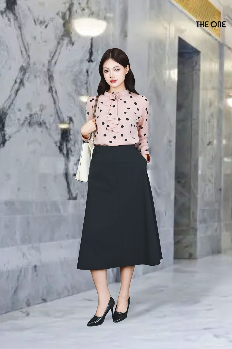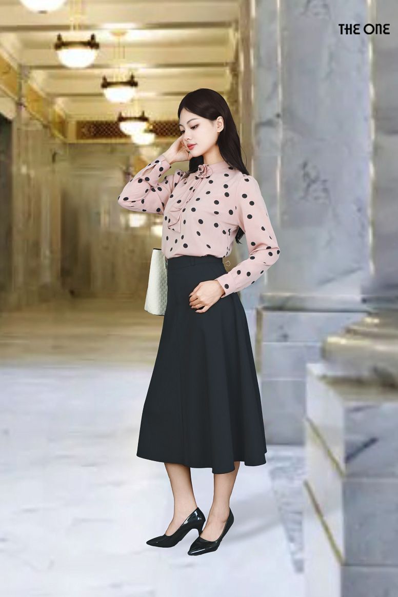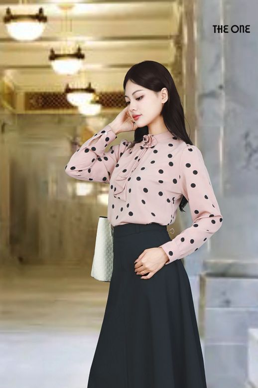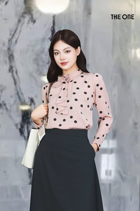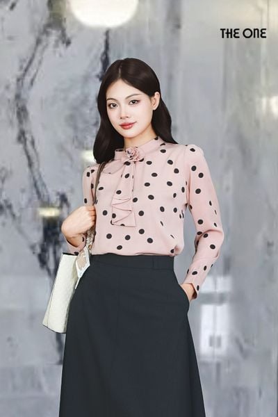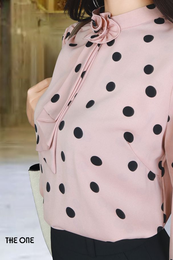 Áo sơ mi tay dài lụa hồng chấm bi đen chân cổ tàu thấp ca vát cổ đính hoa
