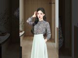 Áo Sơ mi tay dài vải lụa hồng tím hoa nhí xanh dáng suông cổ xếp buộc dây