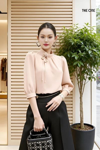 Áo sơ mi lụa be nhạt cổ tàu ly cổ đính hoa tay lỡ