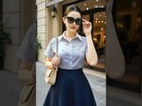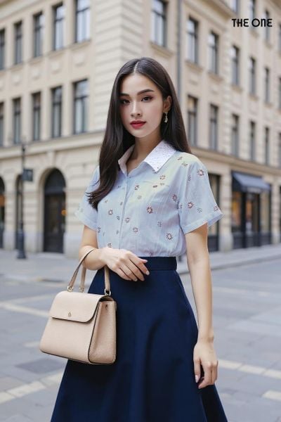 Áo sơ mi croptop tay cộc tơ Nhật xanh nhạt hoa chìm cổ đức ren cơi ngực đính khuy