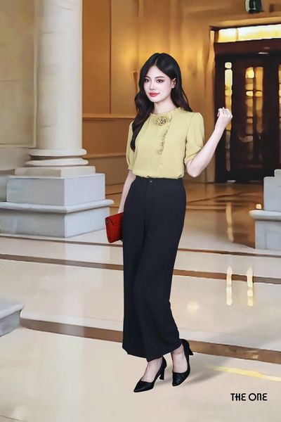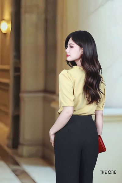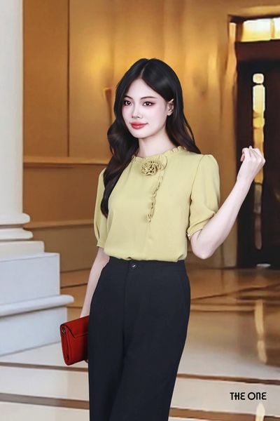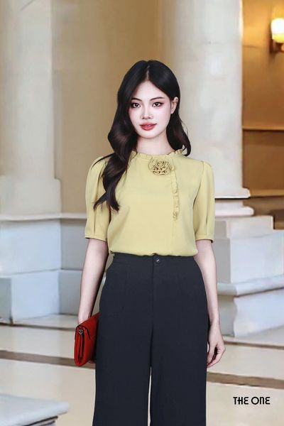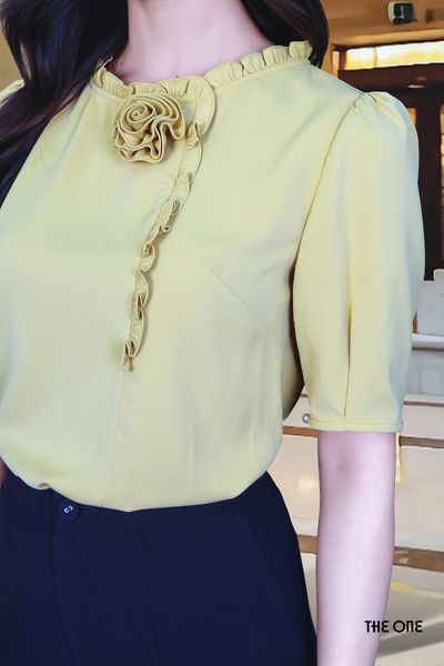 Áo sơ mi tay lỡ lụa vàng tím xếp mí cổ và ngực đính hoa