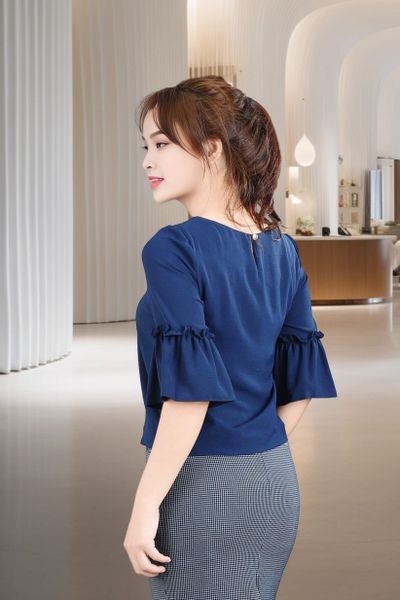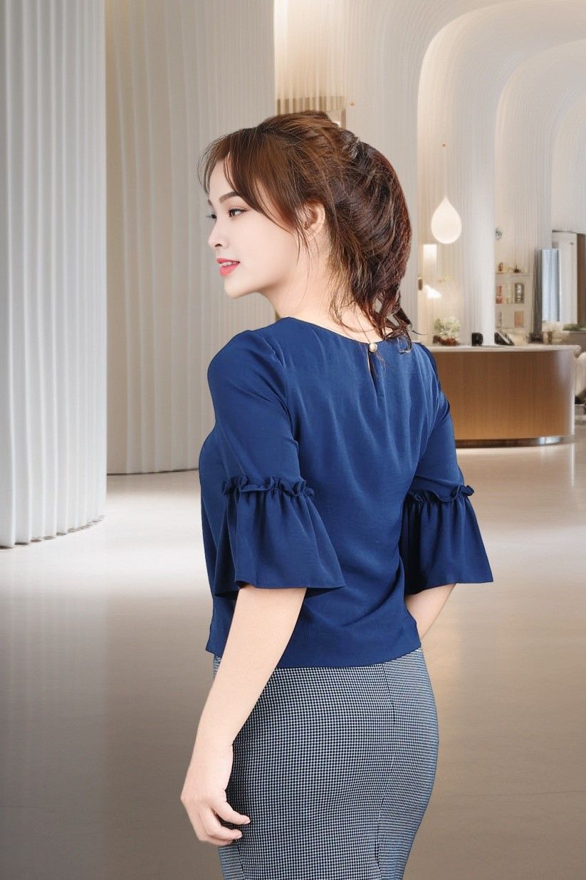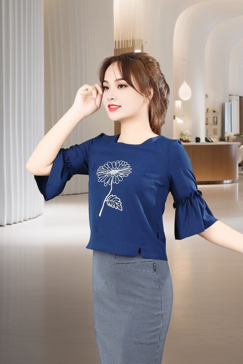 Áo sơ mi tay lỡ đũi nhăn tím than Hàn Quốc thêu hoa ngực đính đá xẻ tay xẻ gấu thân trước