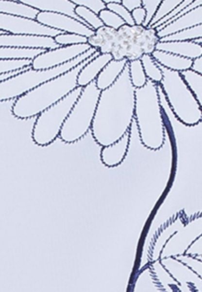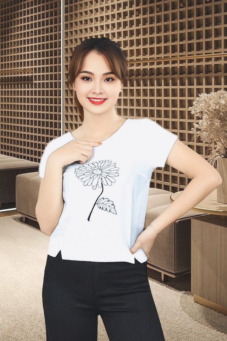 Áo sơ mi tay cộc chéo trắng thêu hoa ngực đính đá xẻ tay xẻ gấu thân trước