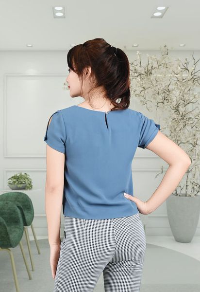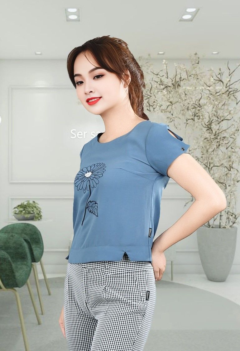 Áo sơ mi tay cộc chéo to xanh ghi thêu hoa ngực đính đá xẻ tay xẻ gấu thân trước