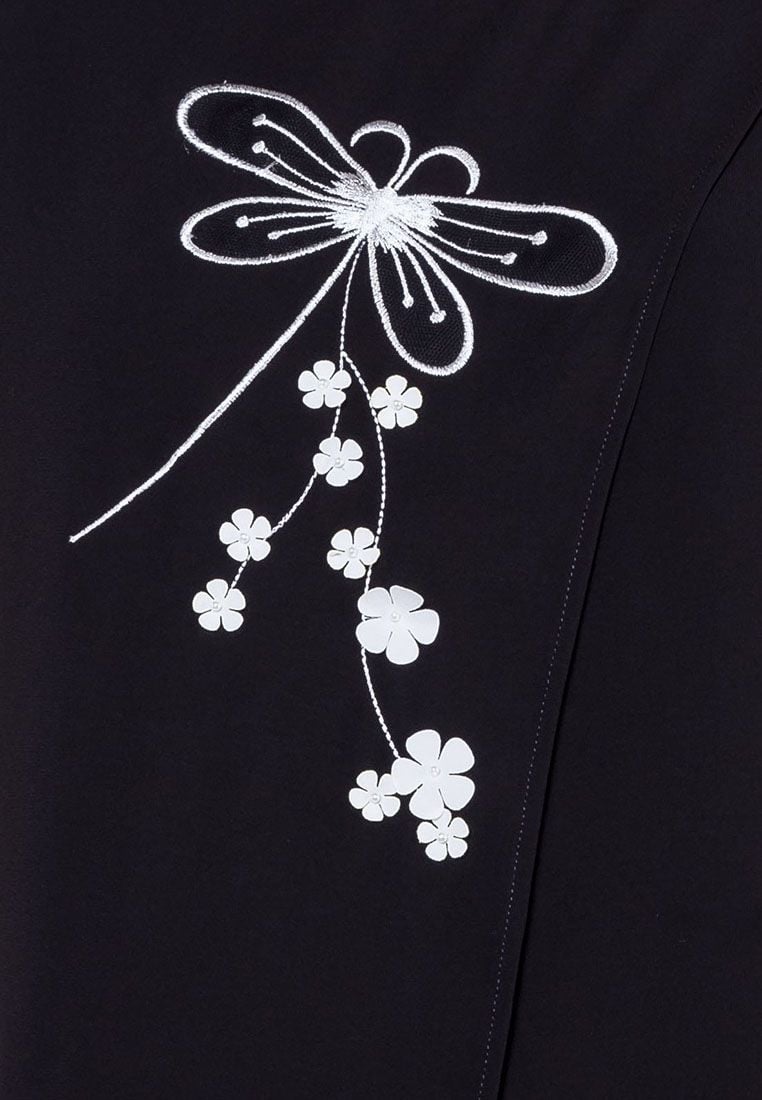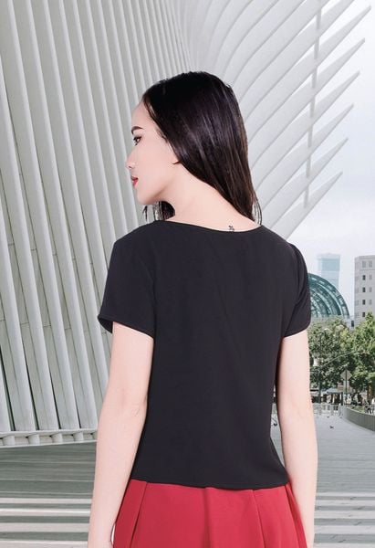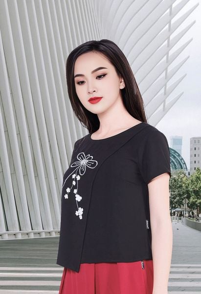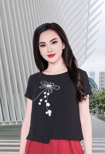 Áo sơ mi tay cộc mango đen thân trước 2 vạt lệch thêu chuồn chuồn cổ tròn