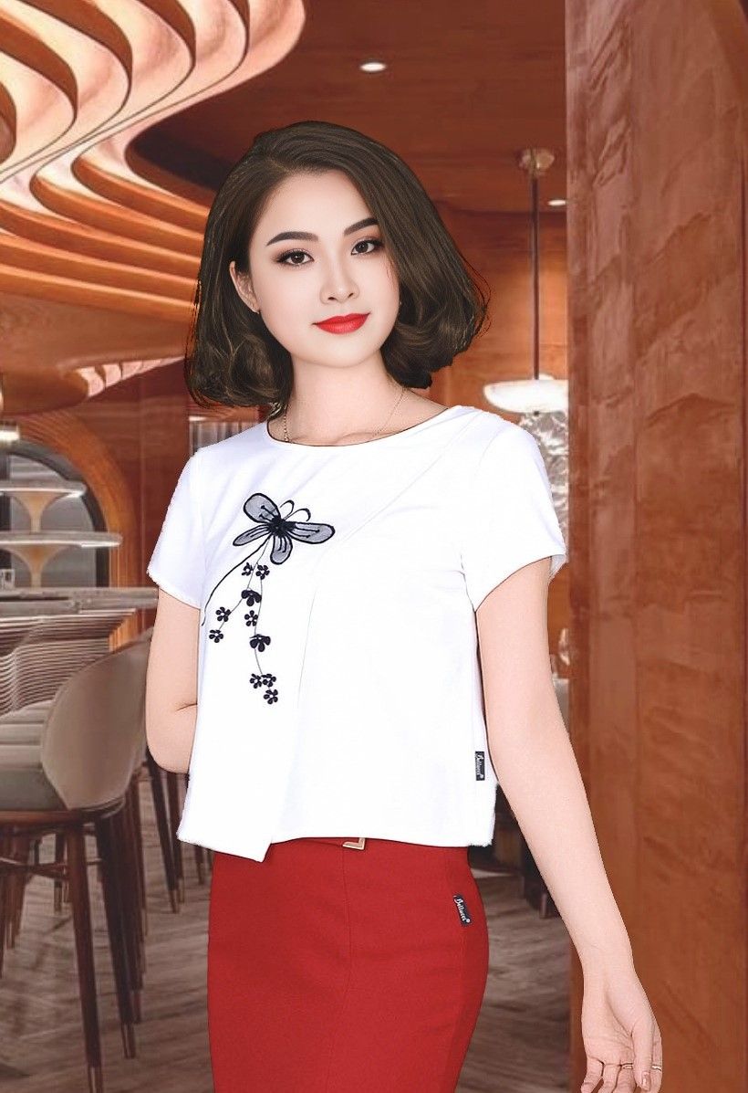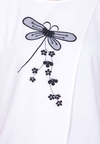 Áo sơ mi tay cộc nhăn trắng thân trước 2 vạt lệch thêu chuồn chuồn cổ tròn