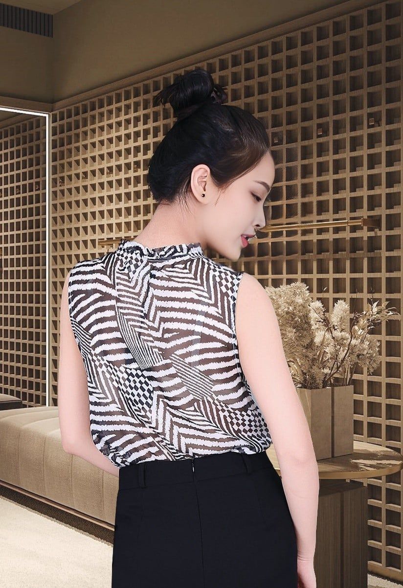 Áo sơ mi sát nách voan silk nền trắng kẻ hình dáng suông cổ xếp buộc dây