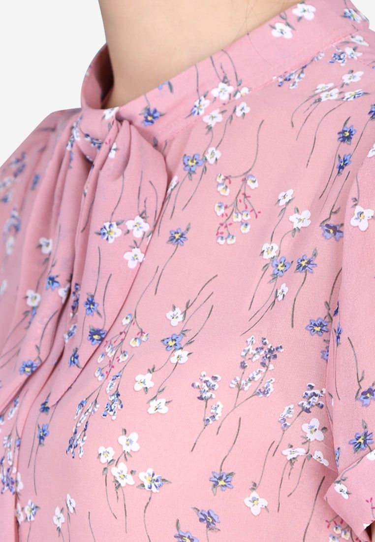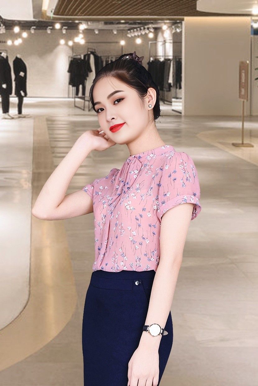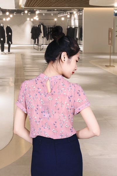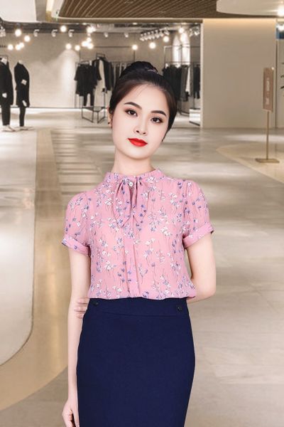 Áo sơ mi tay cộc lụa silk nền hồng hoa nhí cổ tàu leo nơ cổ