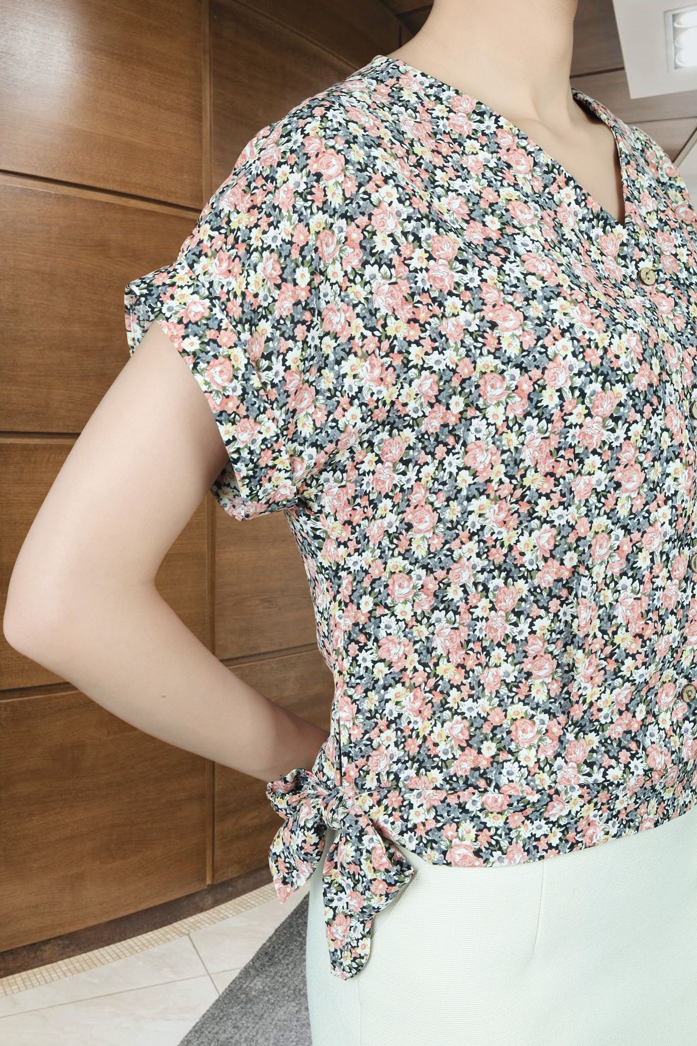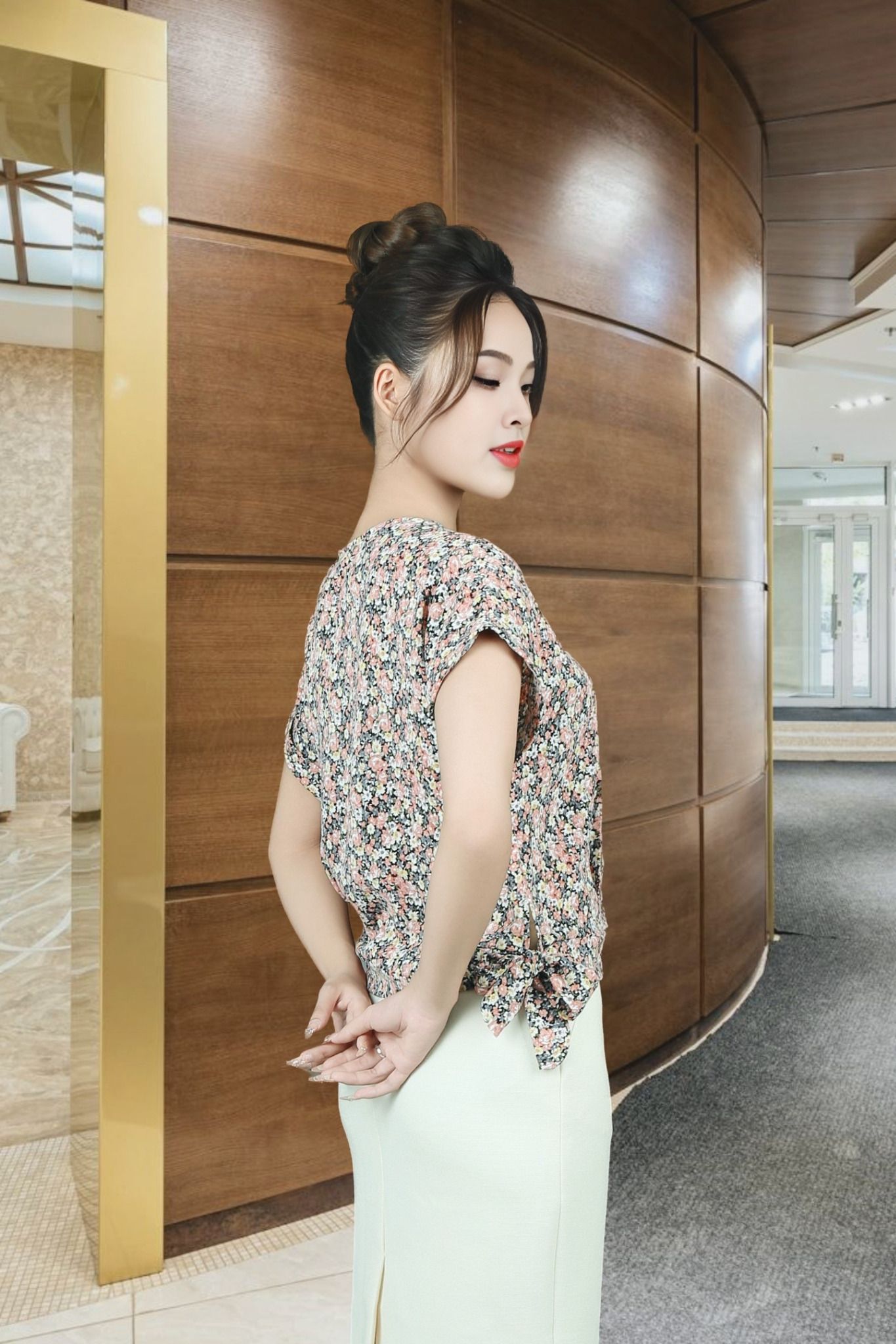 Áo sơ mi cánh dơi cộc vải lụa hàn châu hồng nhí cổ tim thẳng lơ vê gấu tay nơ gấu