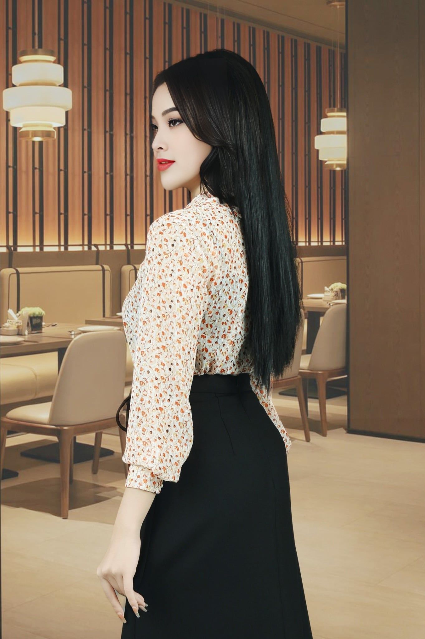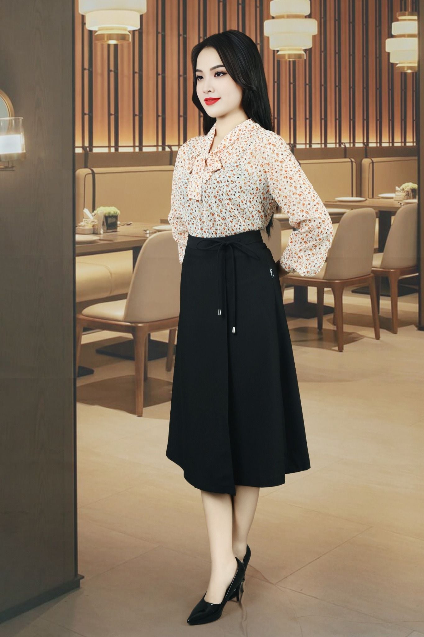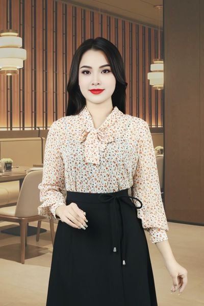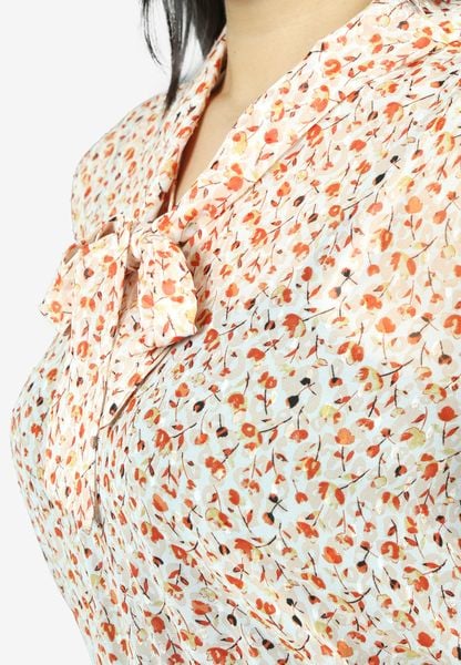 Áo sơ mi tay dài tơ ép hoa nhí cam cổ tim đính nơ ngực