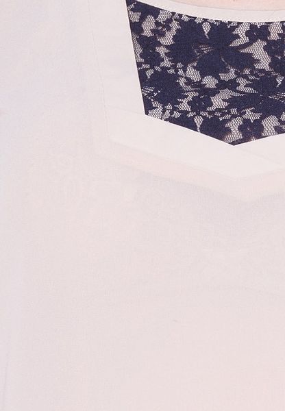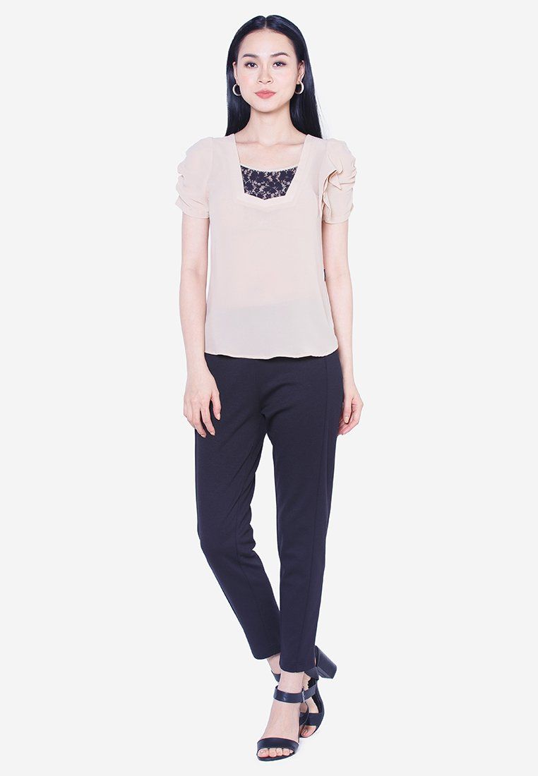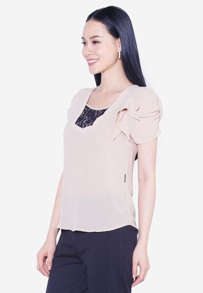 Áo sơ mi chiffon be tay cánh bướm pha ren đen