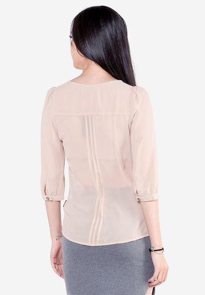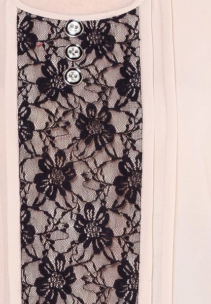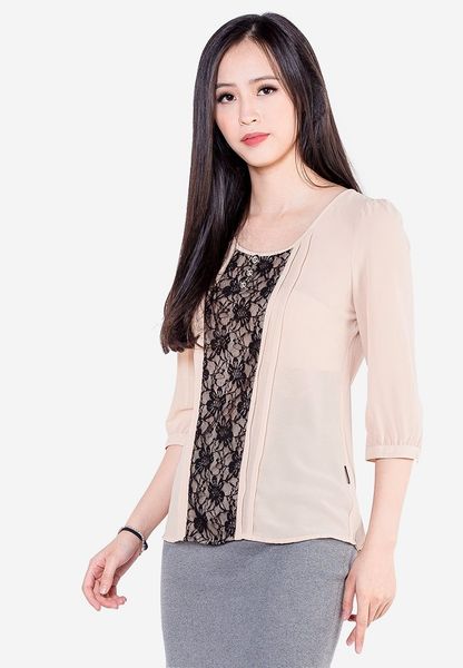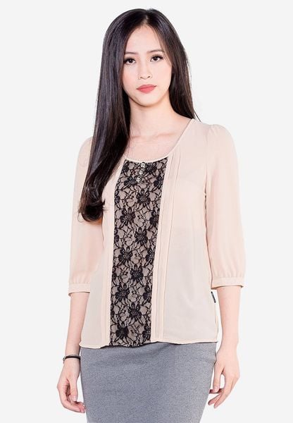 Áo sơ mi chiffon be tay cộc cổ tròn pha ren đen dọc ngực