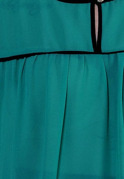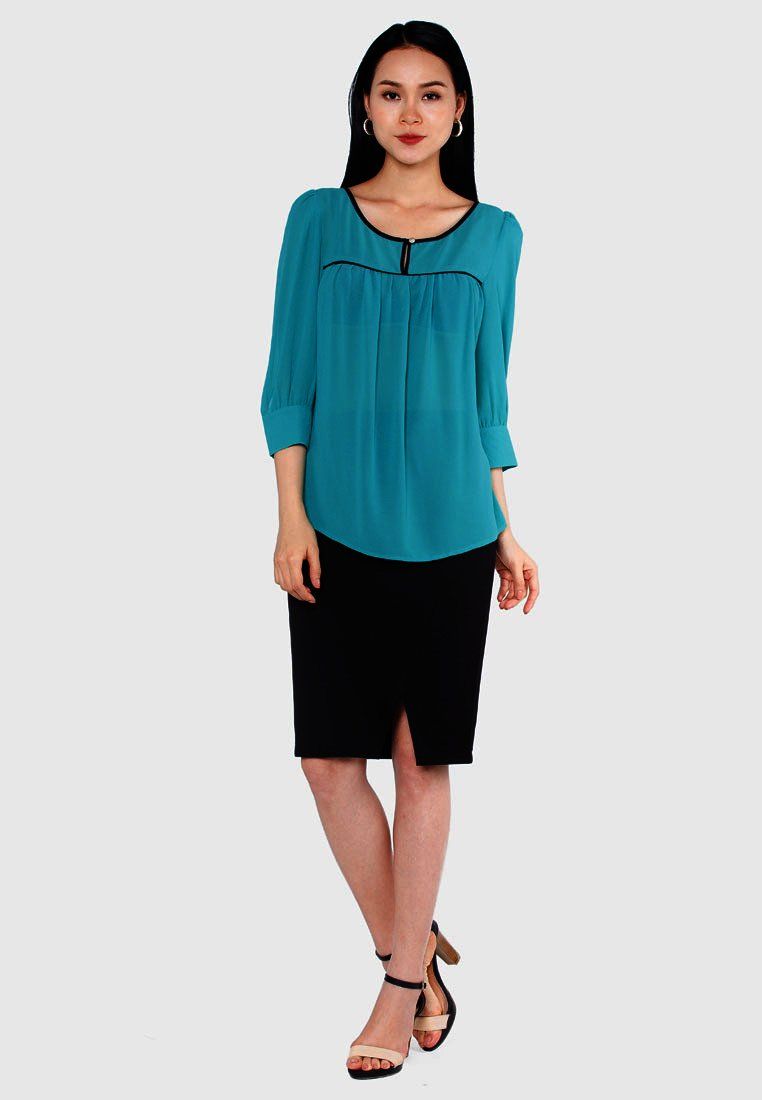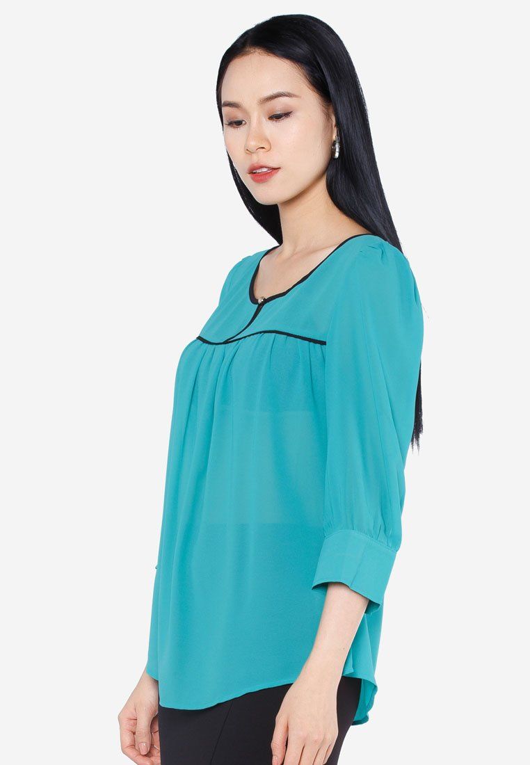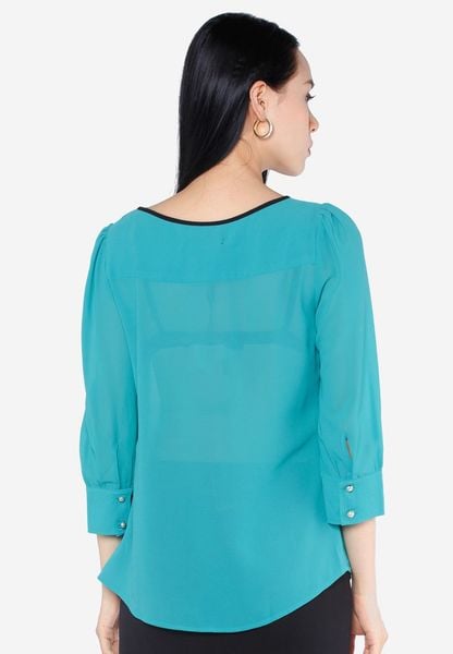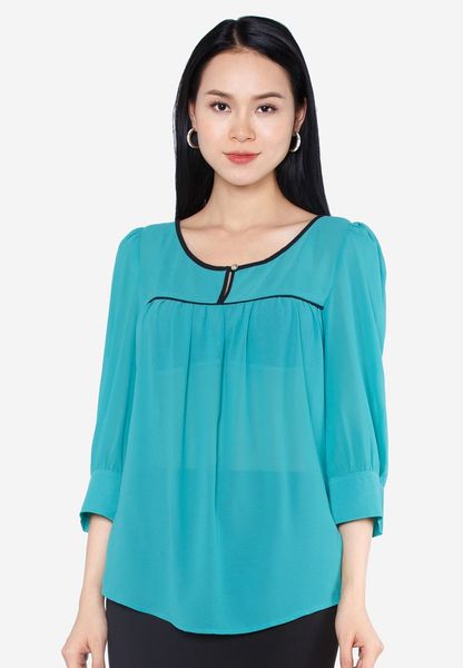 Áo sơ mi chiffon xanh nhạt tay lỡ lé đen nhún ngực