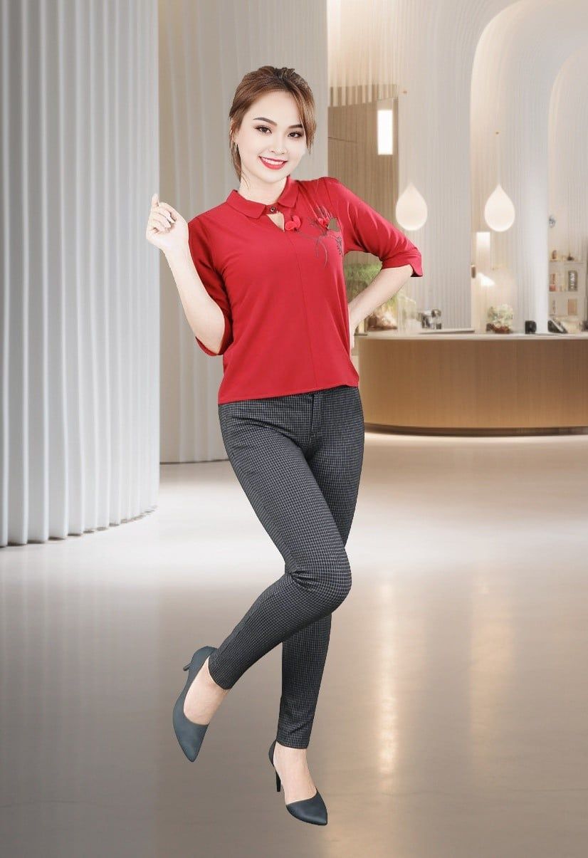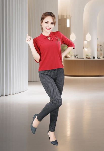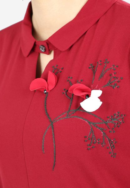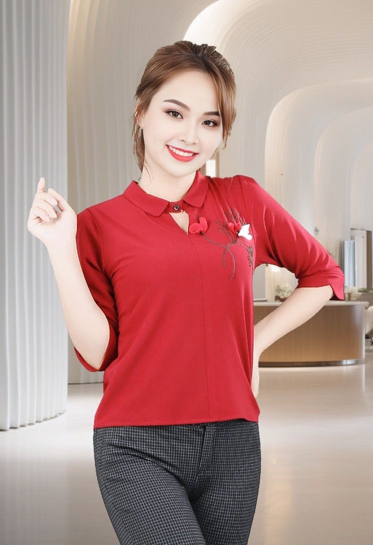 Áo sơ mi tay lỡ măng gồ đỏ đô cổ đức xẻ cài khuy thêu hoa ngực