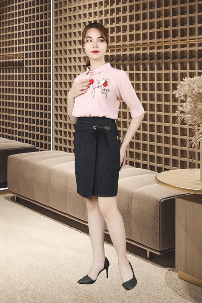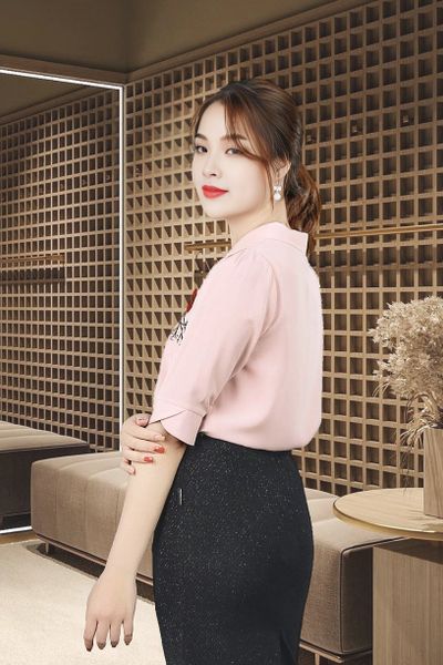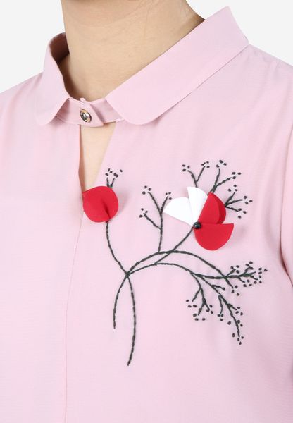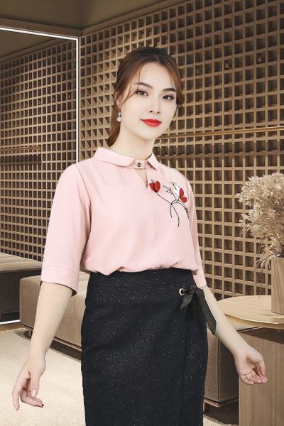 Áo sơ mi tay lỡ chéo to hồng đỗ cổ đức xẻ cài khuy thêu hoa ngực