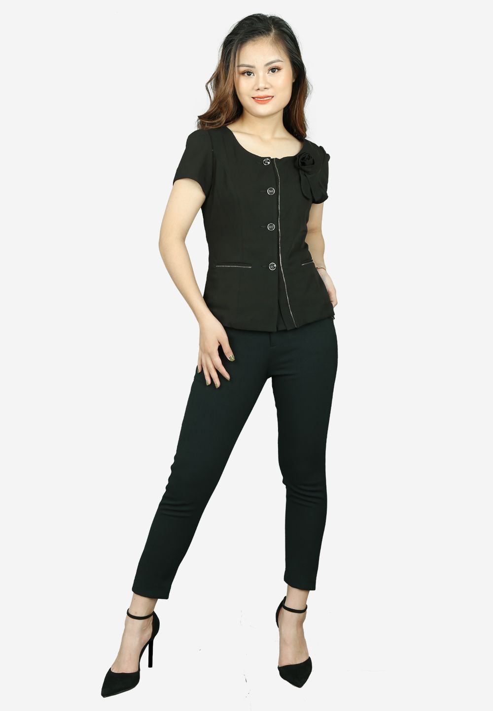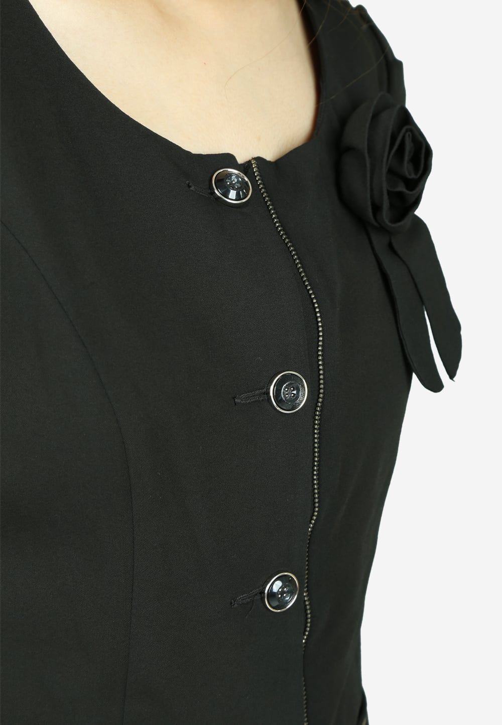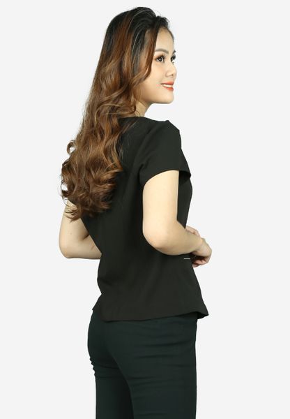 Áo ký giả tay cộc đen cổ tròn nẹp liền hoa trang trí khóa