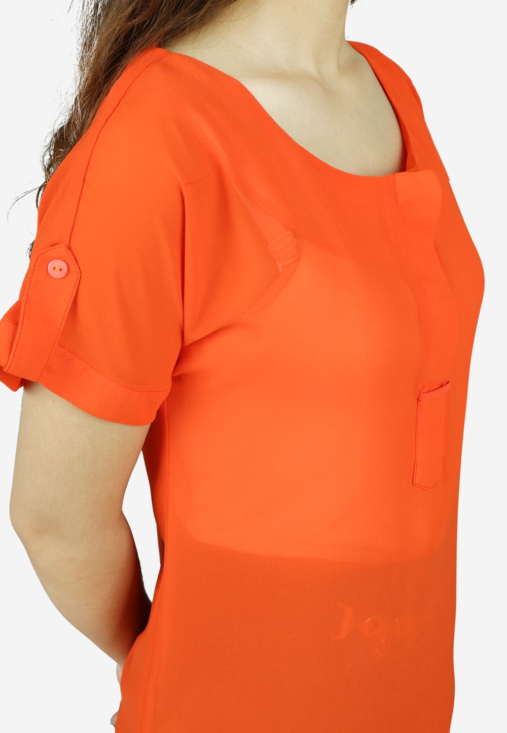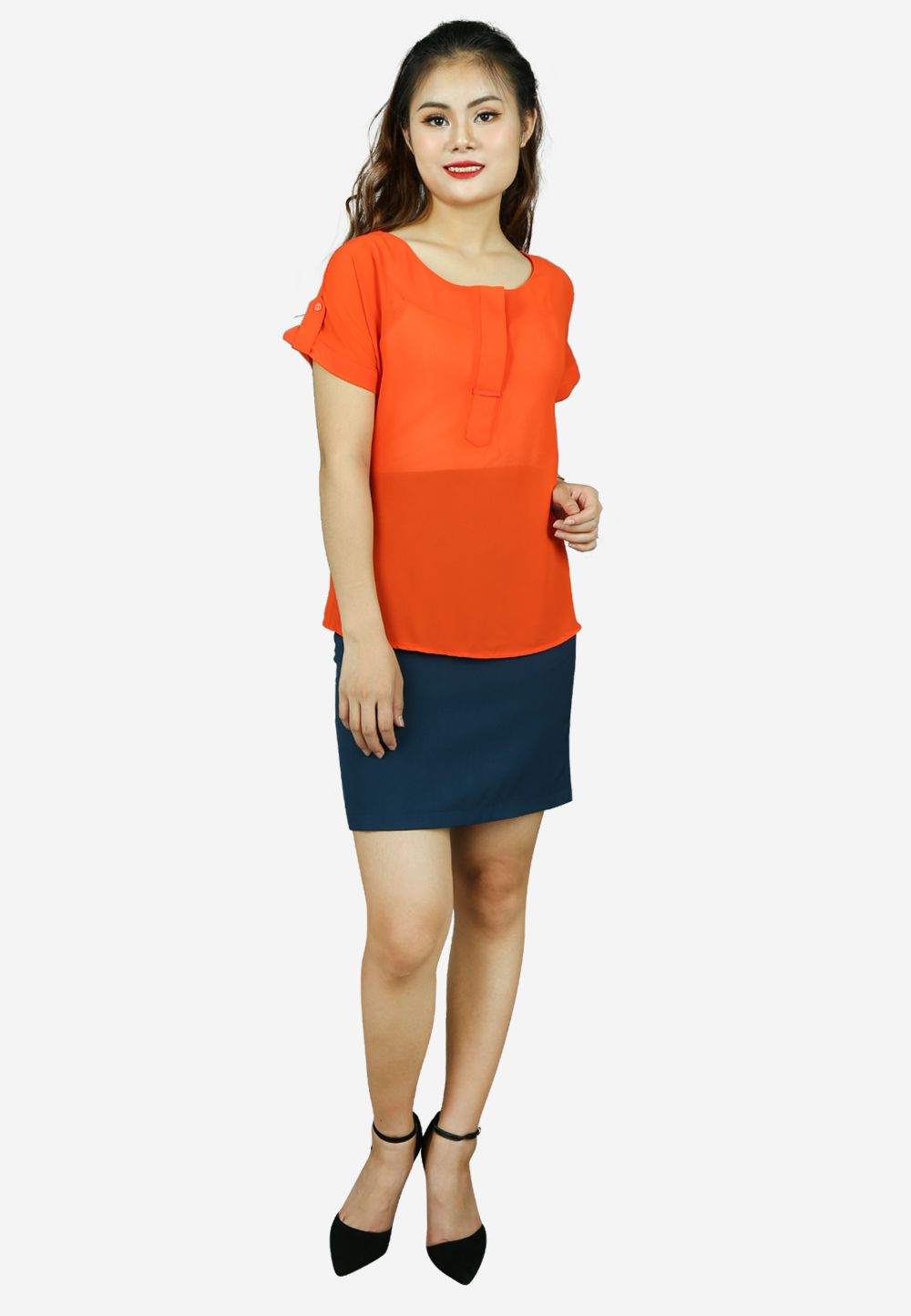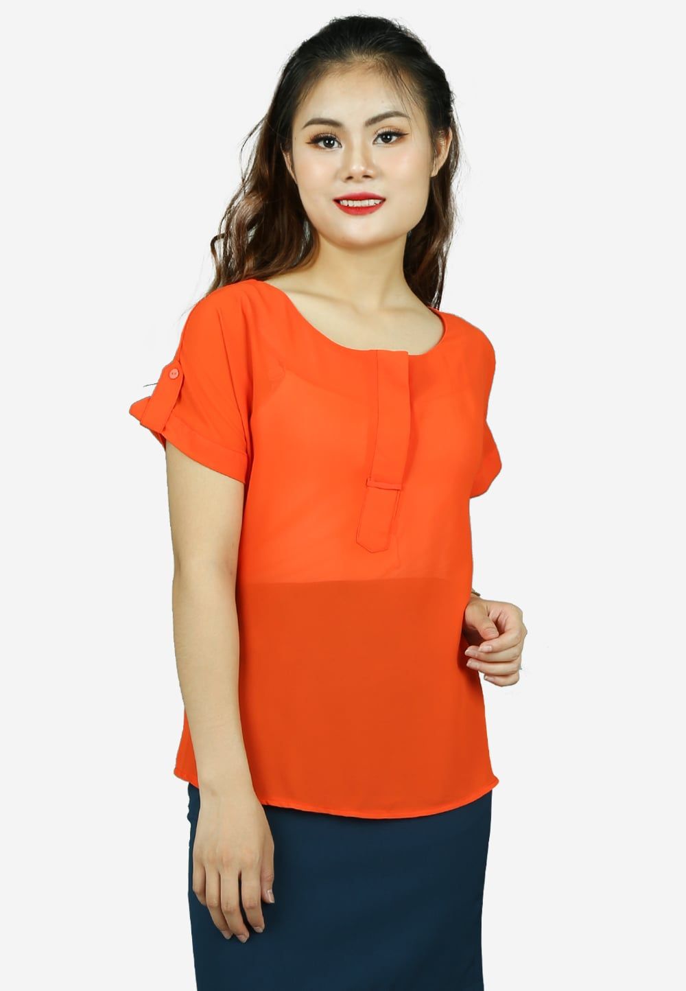 Áo sơ mi chiffon cam tay liền cổ tròn viền trắng