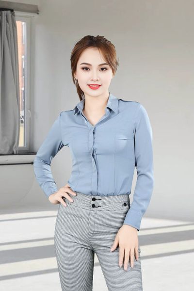 Áo sơ mi lụa tằm xanh cổ đức tay dài nẹp bong