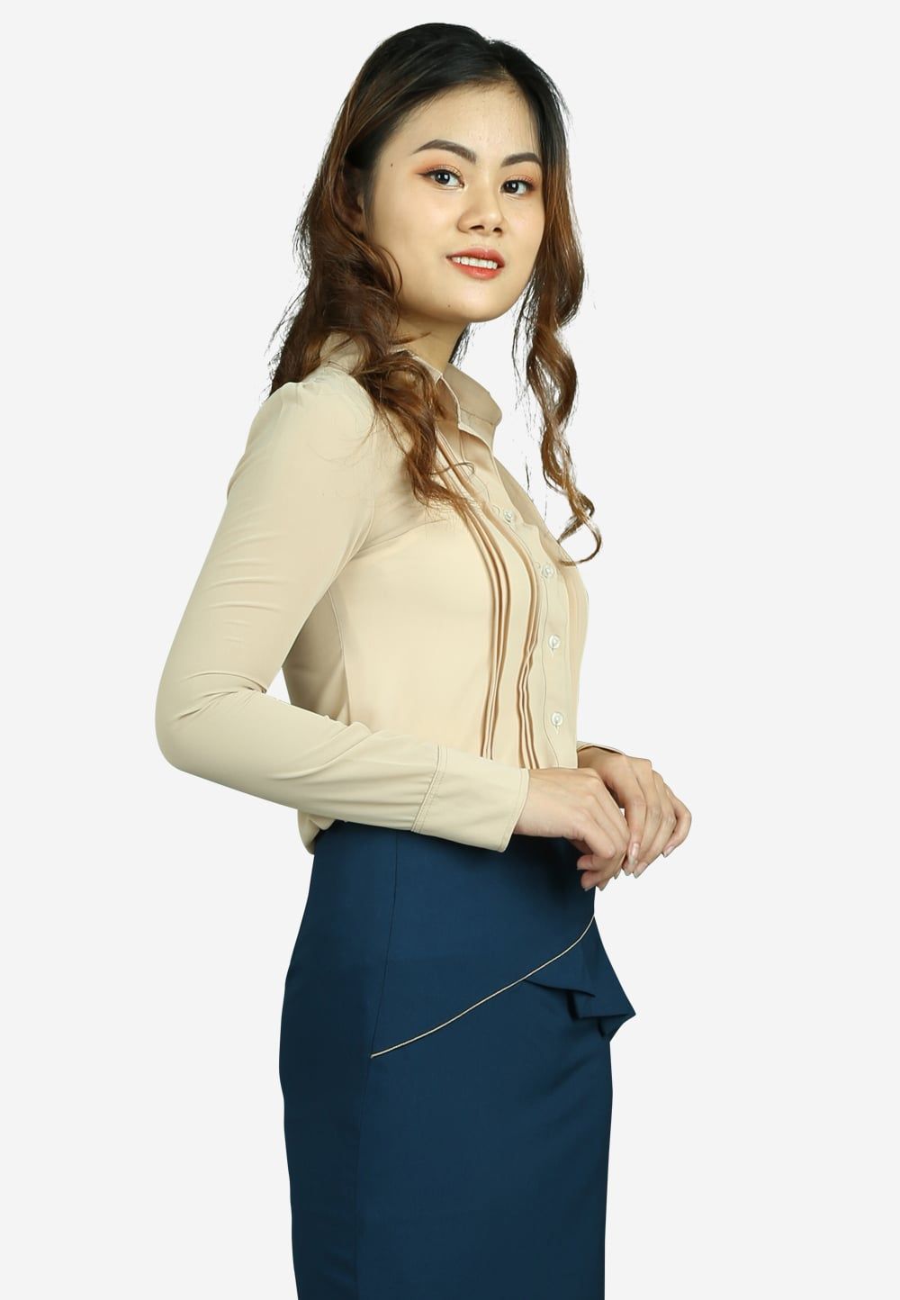 Áo sơ mi chiffon be tay dài mí 5 li