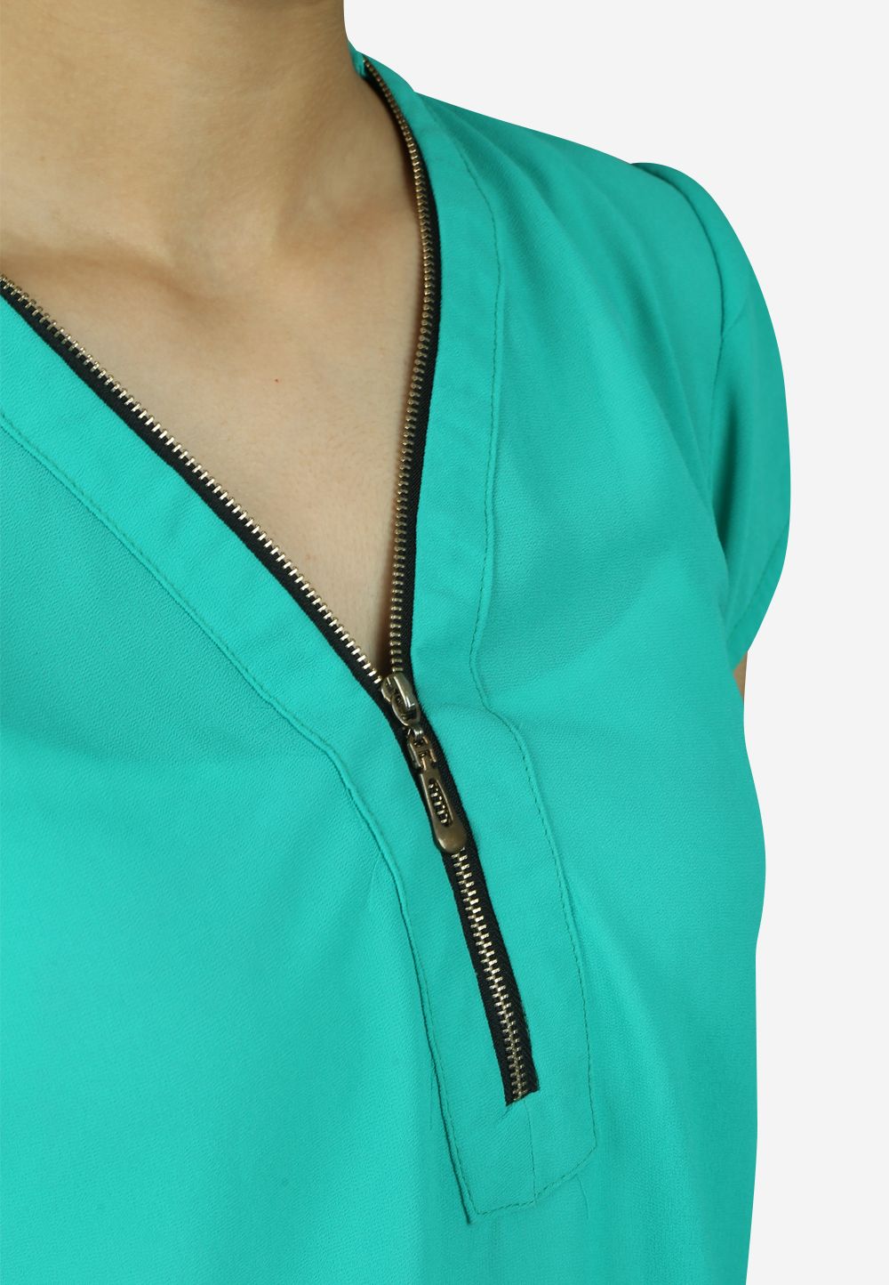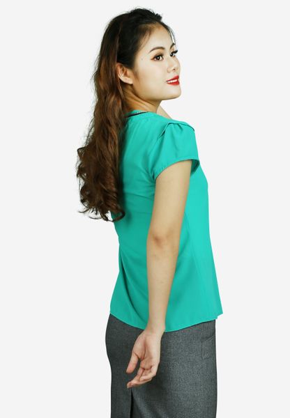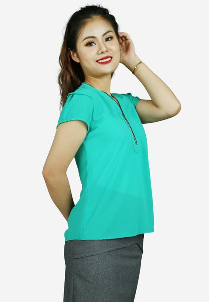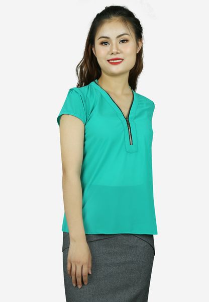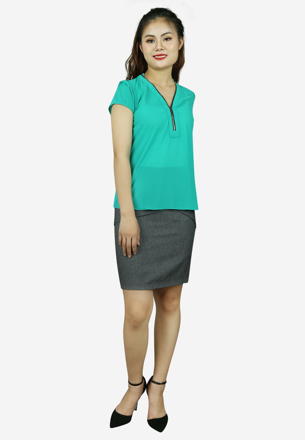 Áo sơ mi chiffon xanh nhạt cổ Y kẹp khóa