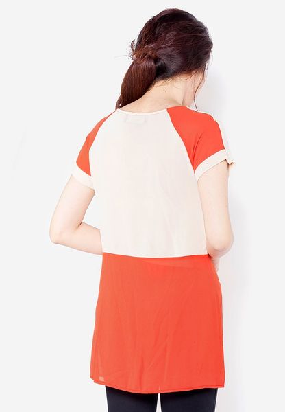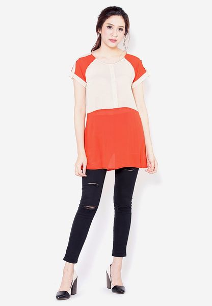 Áo sơ mi chiffon cam pha be tay zéc lăng cá tay cổ tròn bổ nẹp giữa