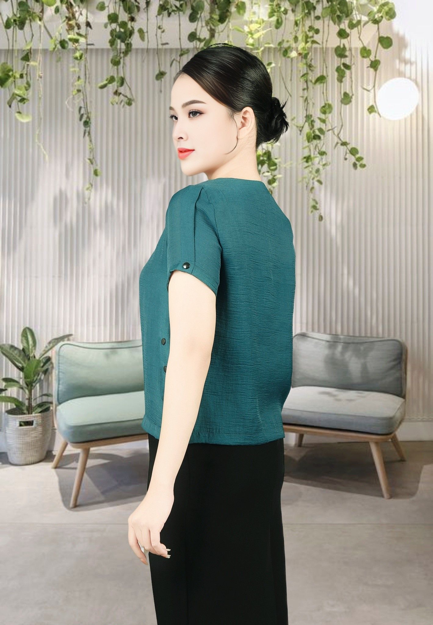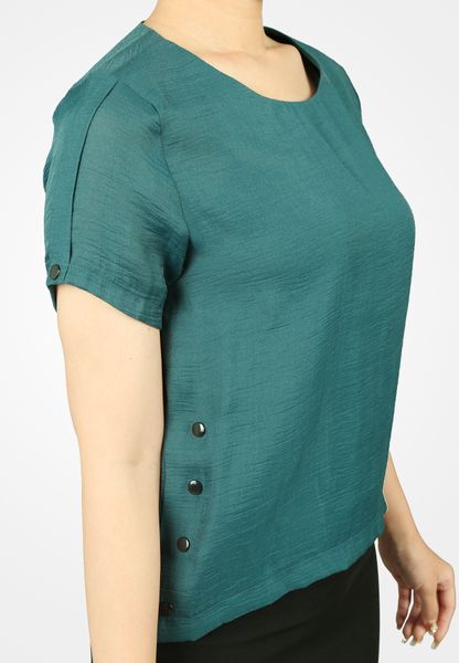 Áo sơ mi tay cộc croptop tơ xanh cổ vịt khuy trang trí bên sườn