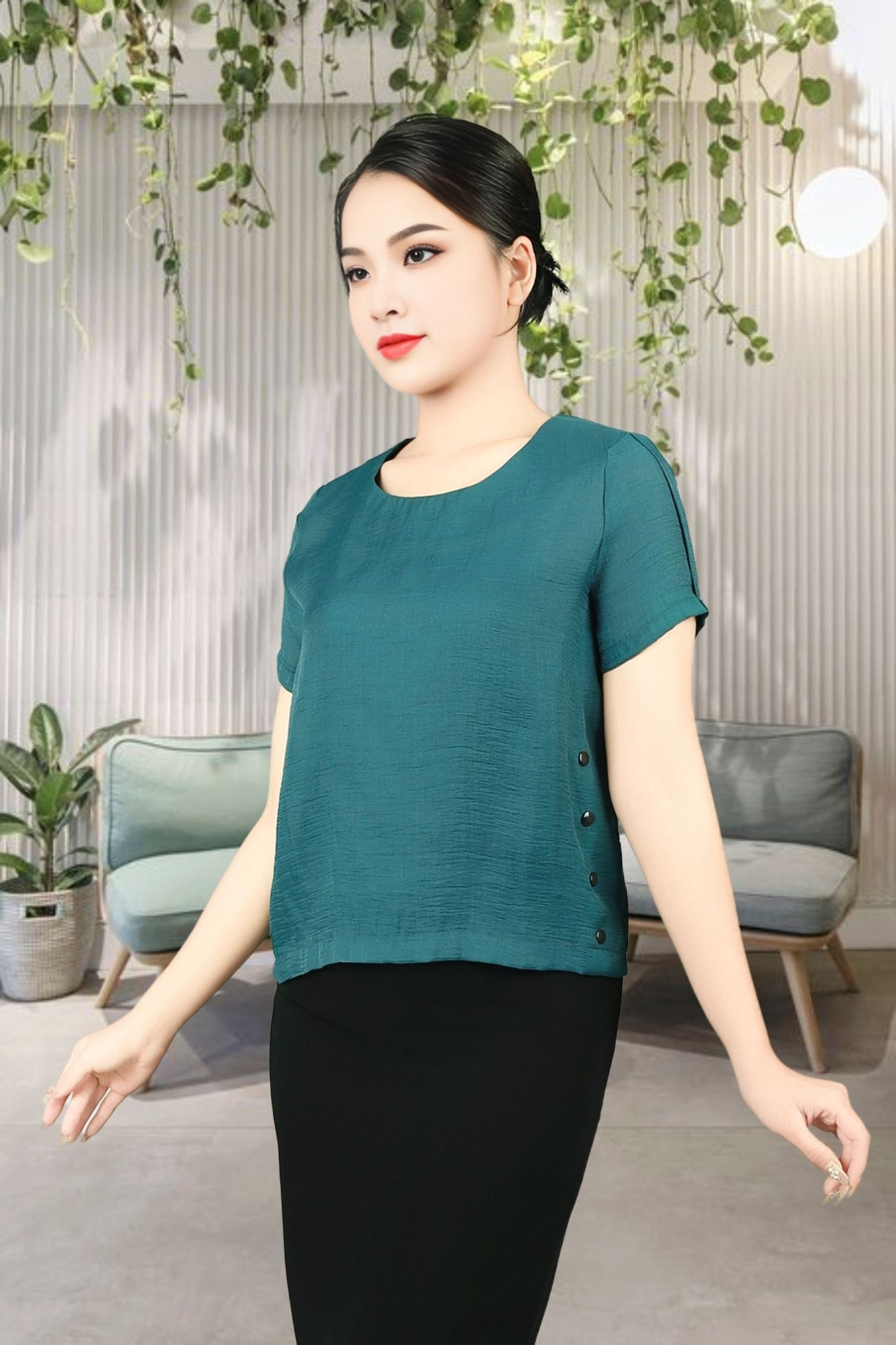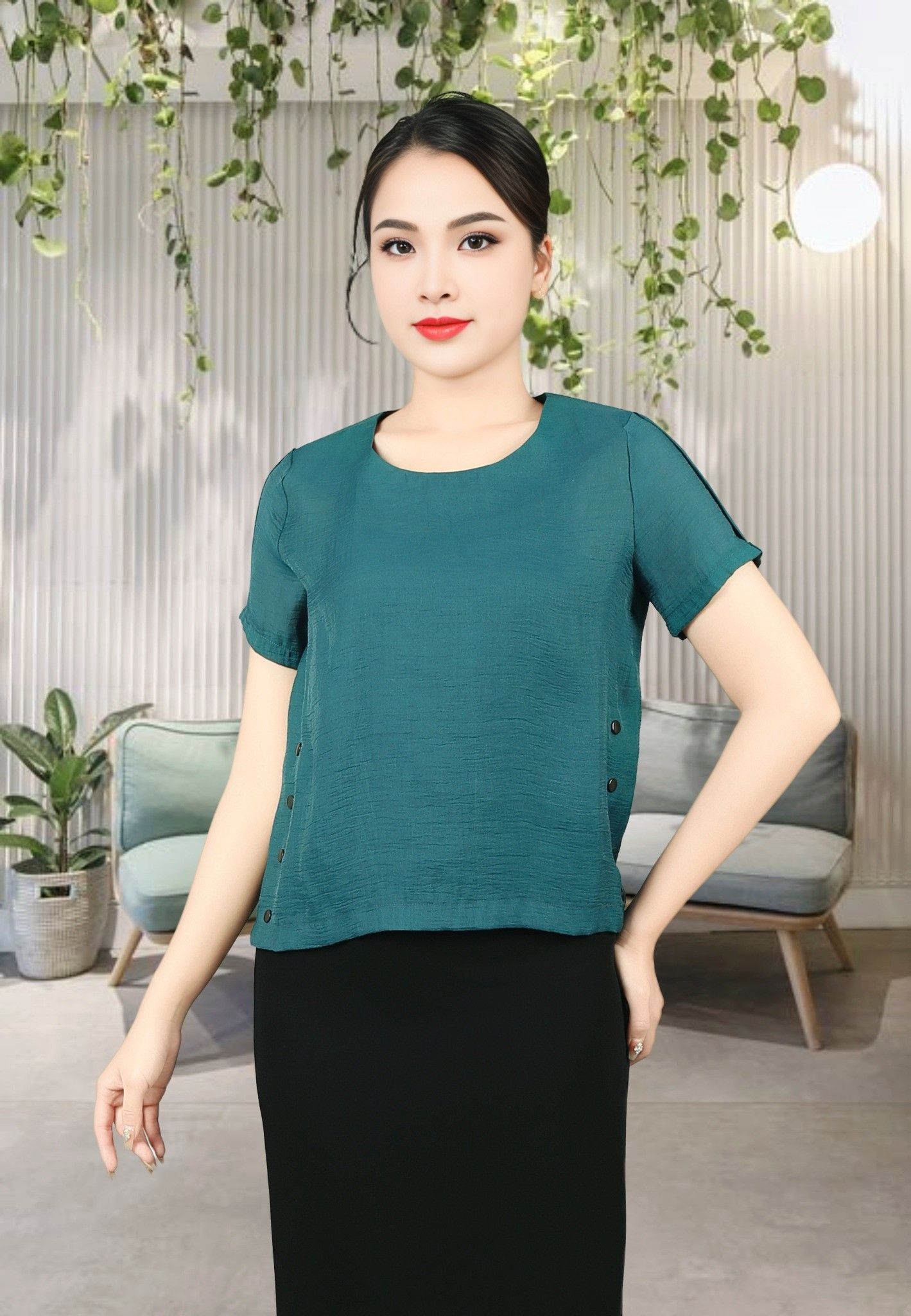Áo sơ mi tay cộc croptop tơ xanh cổ vịt là một sản phẩm thời trang đầy phong cách và sự trẻ trung. Với kiểu dáng croptop, áo giúp tôn lên vóc dáng và làm cho người mặc trông thon gọn hơn. Chất liệu tơ xanh cao cấp giúp áo có độ bền cao, mềm mại và thoáng mát, giúp người mặc cảm thấy thoải mái và dễ chịu.Cổ vịt là điểm nhấn của sản phẩm, tạo nên sự khác biệt và độc đáo cho áo sơ mi. Ngoài ra, cổ vịt còn giúp che đi những khuyết điểm trên cổ và vai, giúp người mặc trông thon gọn hơn. Khuy trang trí bên sườn giúp tăng thêm tính thẩm mỹ cho áo sơ mi, làm cho áo trở nên sang trọng và đẳng cấp hơn.Với sự kết hợp giữa kiểu dáng croptop, chất liệu tơ xanh cao cấp và khuy trang trí bên sườn, áo sơ mi tay cộc croptop tơ xanh cổ vịt là một sản phẩm thời trang đầy phong cách và sự trẻ trung. Sản phẩm này sẽ là lựa chọn hoàn hảo cho những cô nàng yêu thích phong cách trẻ trung và năng động.