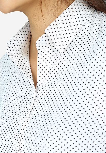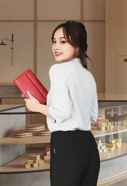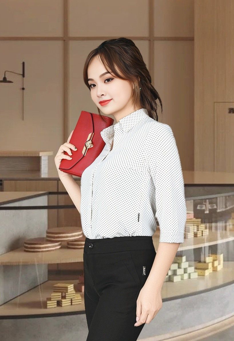 Áo sơ mi tay lỡ lụa nền trắng chấm bi đen tăm cổ đức nhỏ tay tròn
