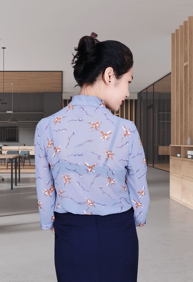 Áo sơ mi tay lỡ voan silk nền ghi hoa nâu trắng cổ đức dây nơ cổ