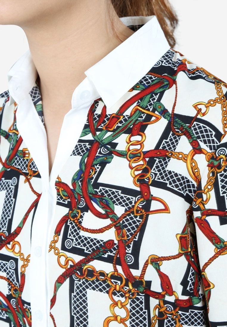 Áo sơ mi cổ đức tay lỡ vải đũi hình vàng dây xích cổ và nẹp phối trắng