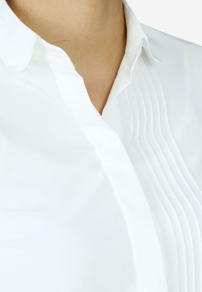 Áo sơ mi tay dài vải nhuyễn trắng cổ đức tròn thân trước xếp 6 li