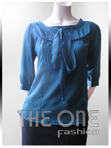 Áo sơ mi cát xanh tay lỡ cổ tròn nơ cổ xếp li