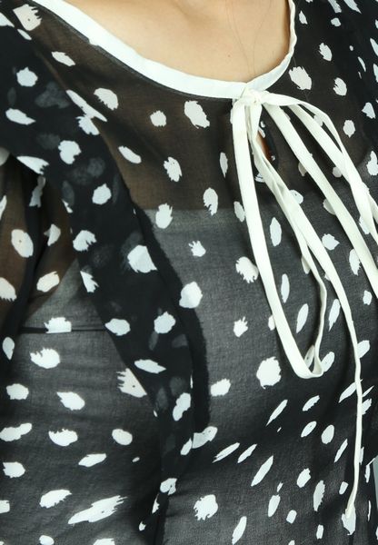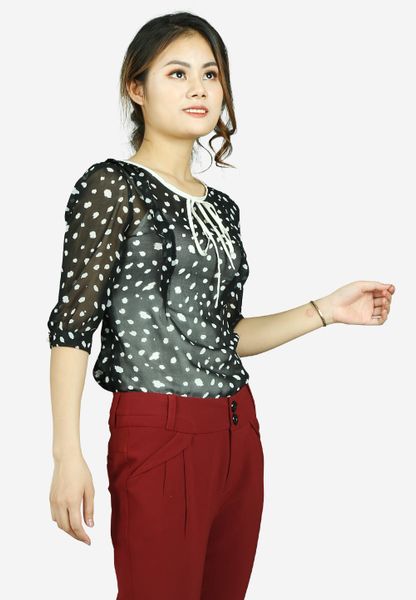 Áo sơ mi voan chấm bi đen tay lỡ cổ tròn dây nơ bèo vai