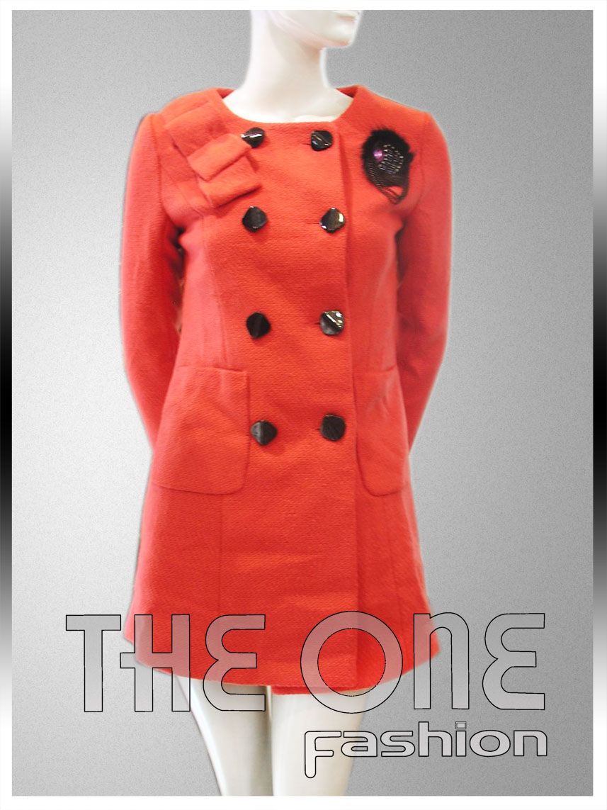 Áo măng tô dài dạ cam cổ tròn 2 túi 2 hàng khuy