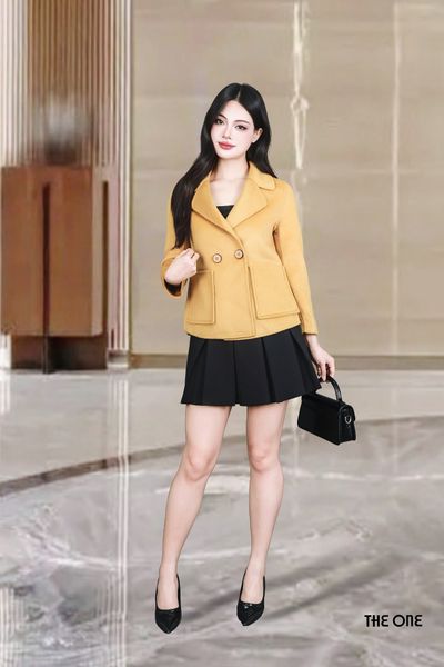Áo măng tô dạ lông cừu 2 mặt vàng đậm dáng ngắn cổ B 2 hàng khuy túi ốp