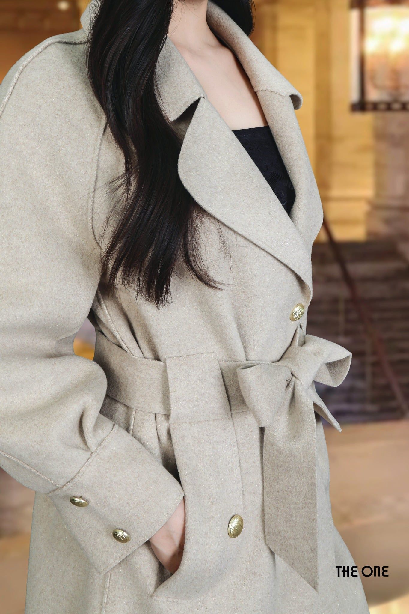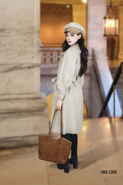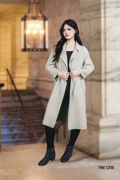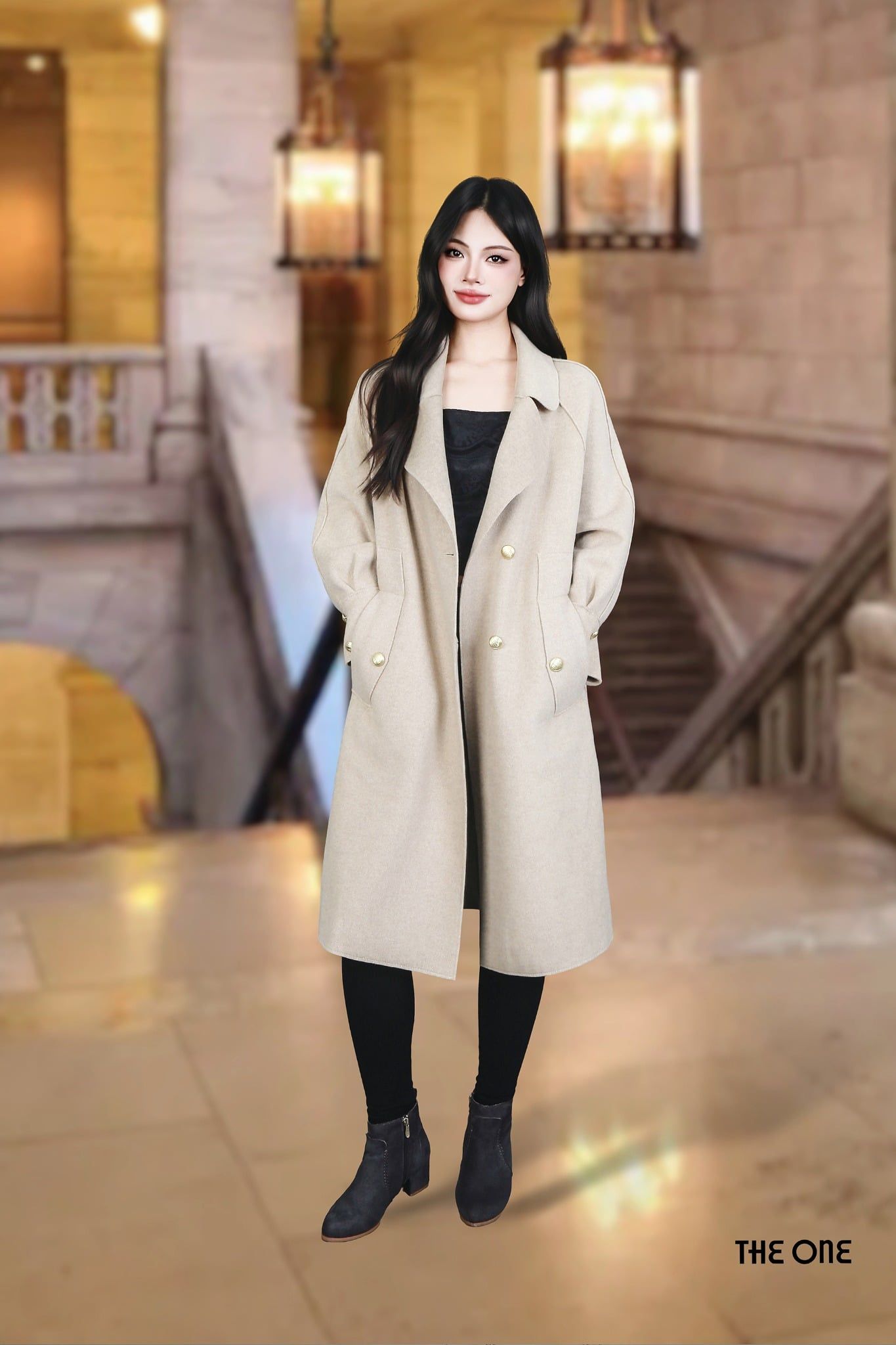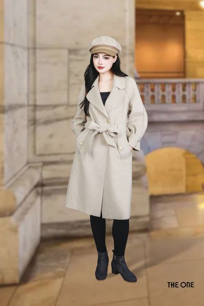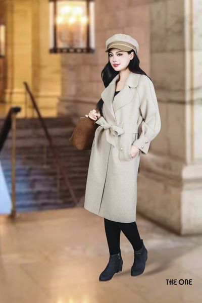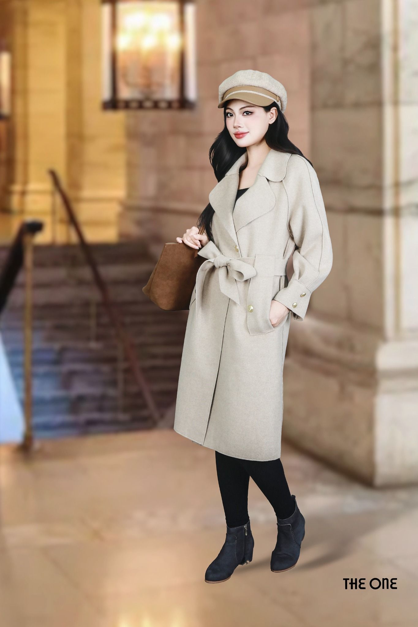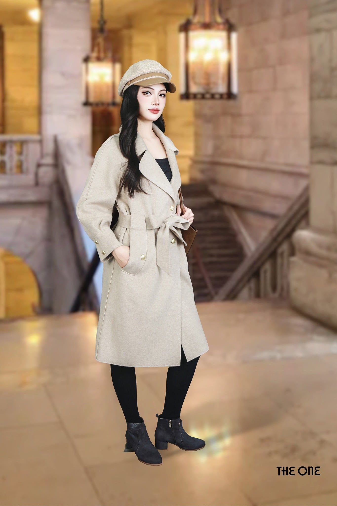 Áo măng tô dạ lông cừu 2 mặt be KT Freesize cổ B dây đai dáng dài bo gấu tay