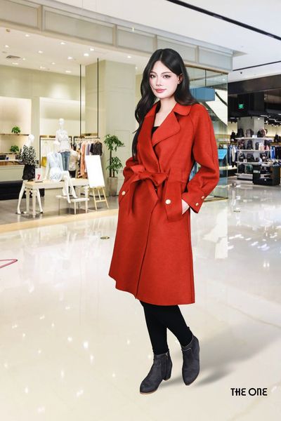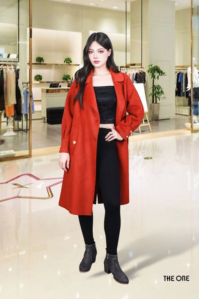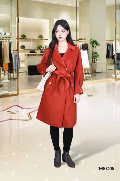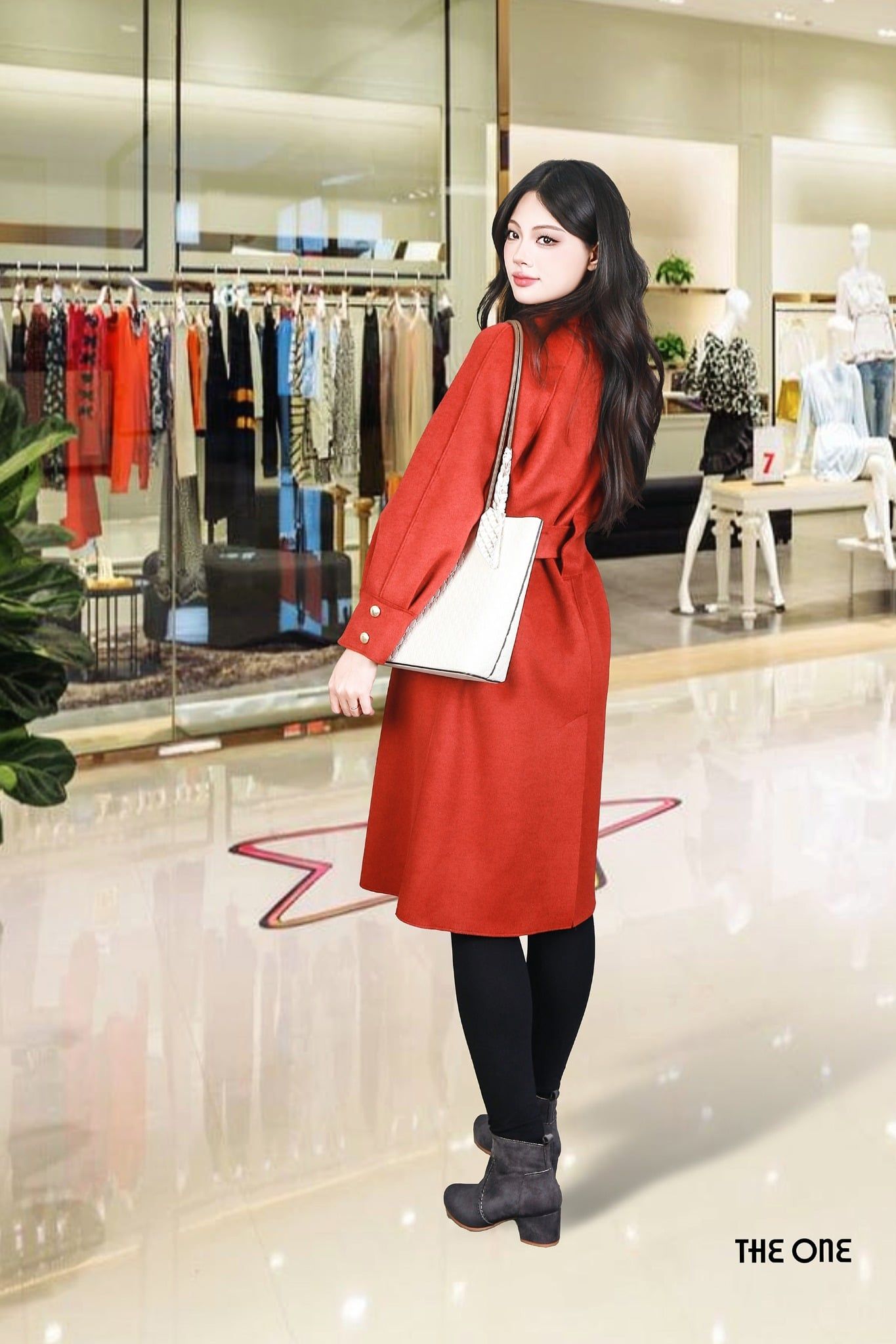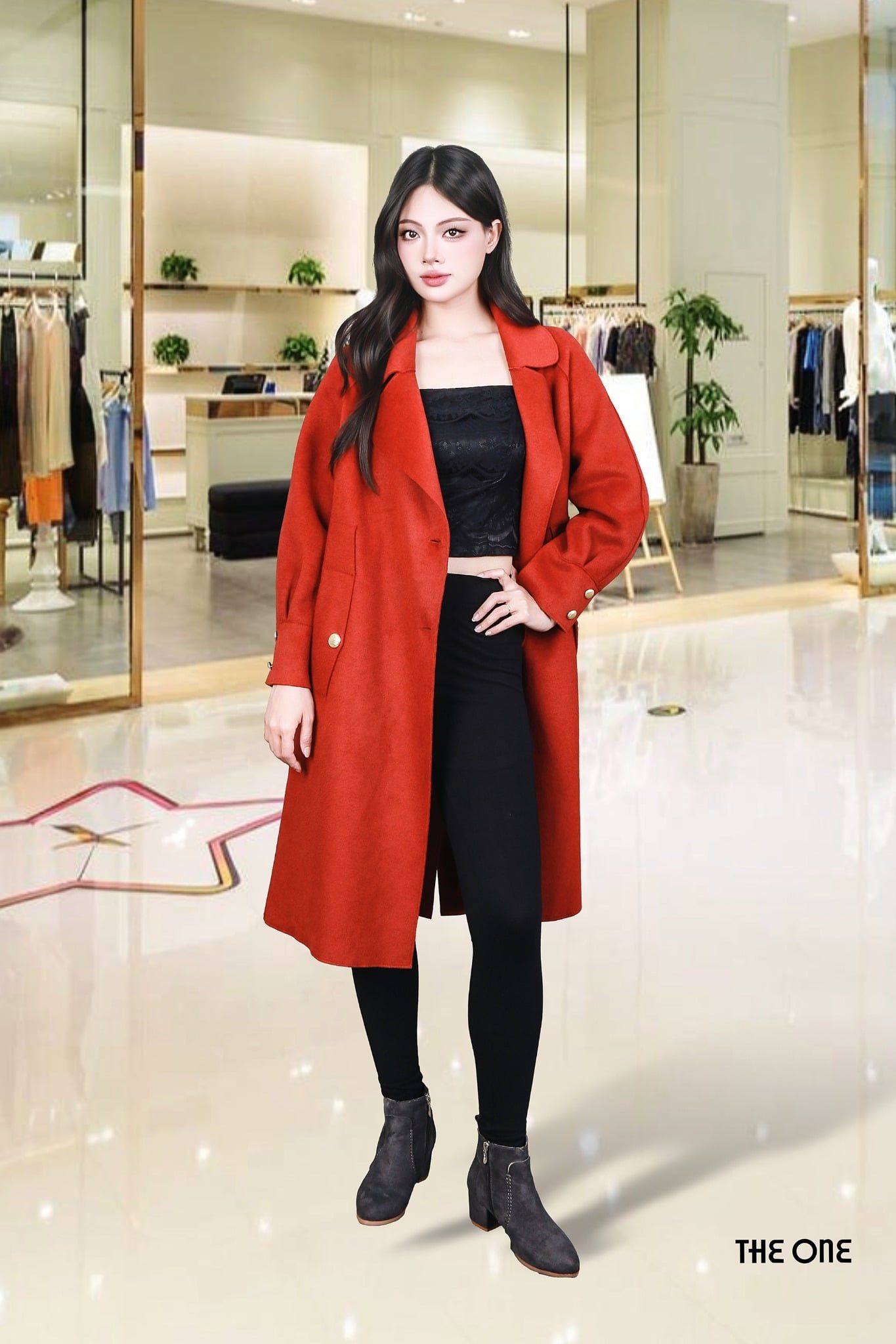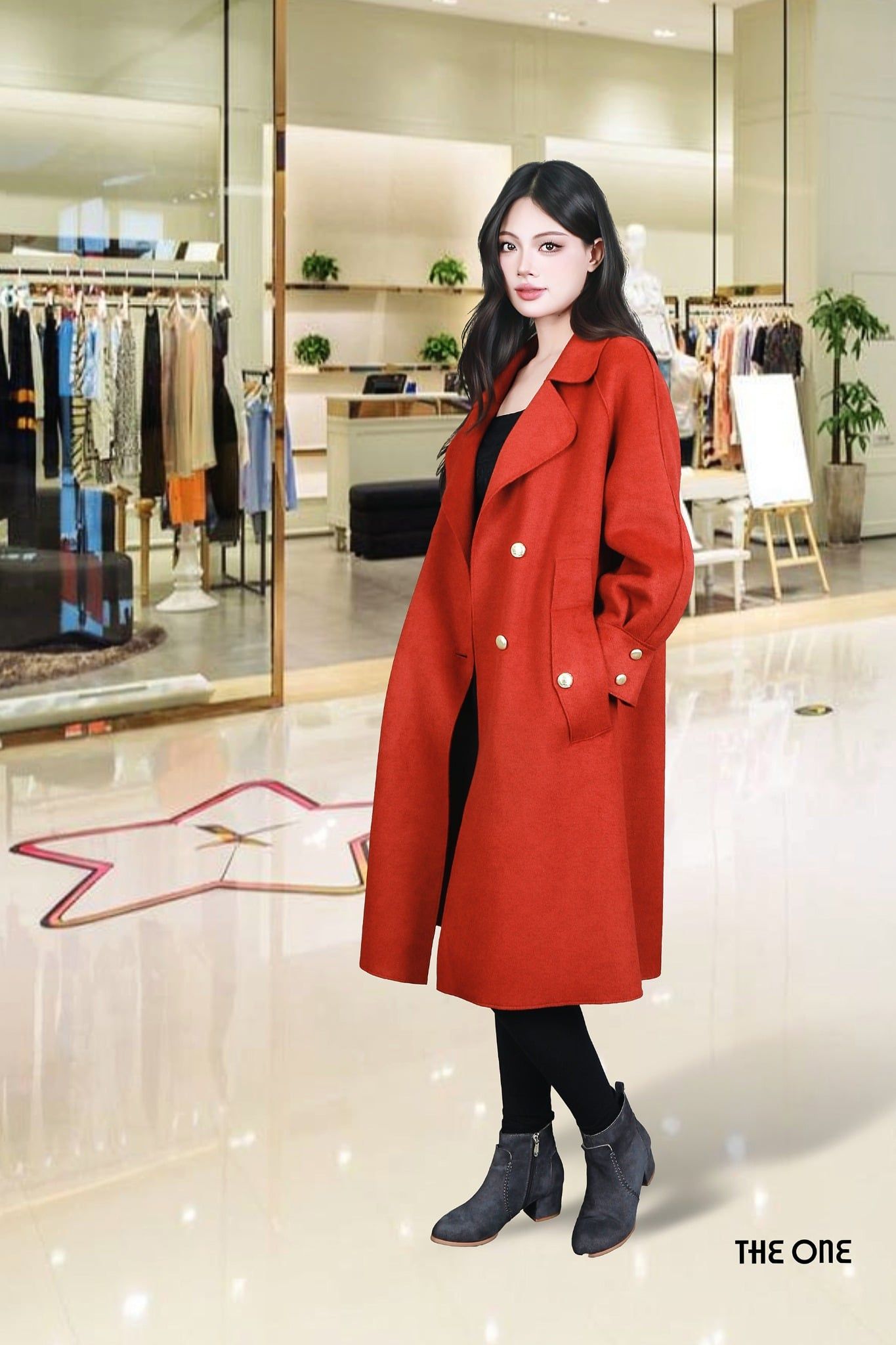 Áo măng tô dạ lông cừu 2 mặt đỏ cam Freesize cổ B dây đai dáng dài bo gấu tay