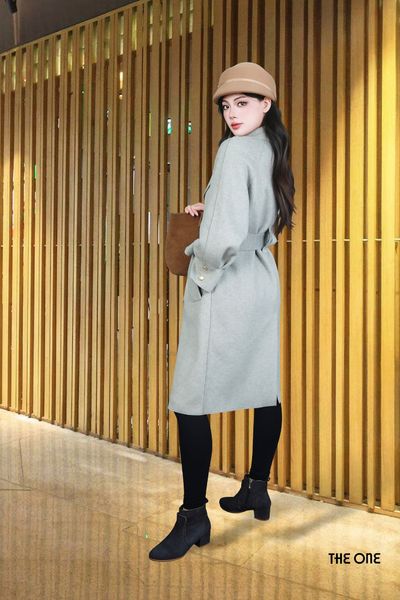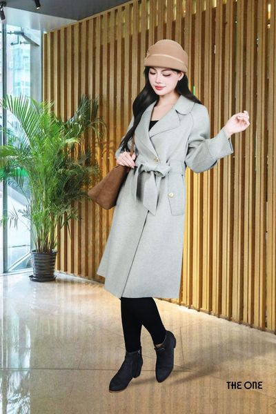 Áo măng tô dạ lông cừu 2 mặt ghi Freesize cổ B dây đai dáng dài bo gấu tay