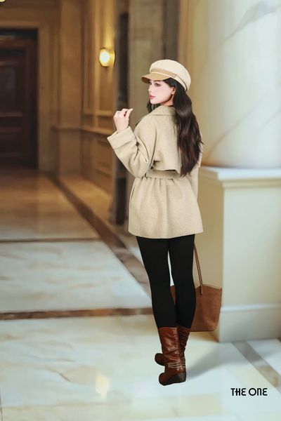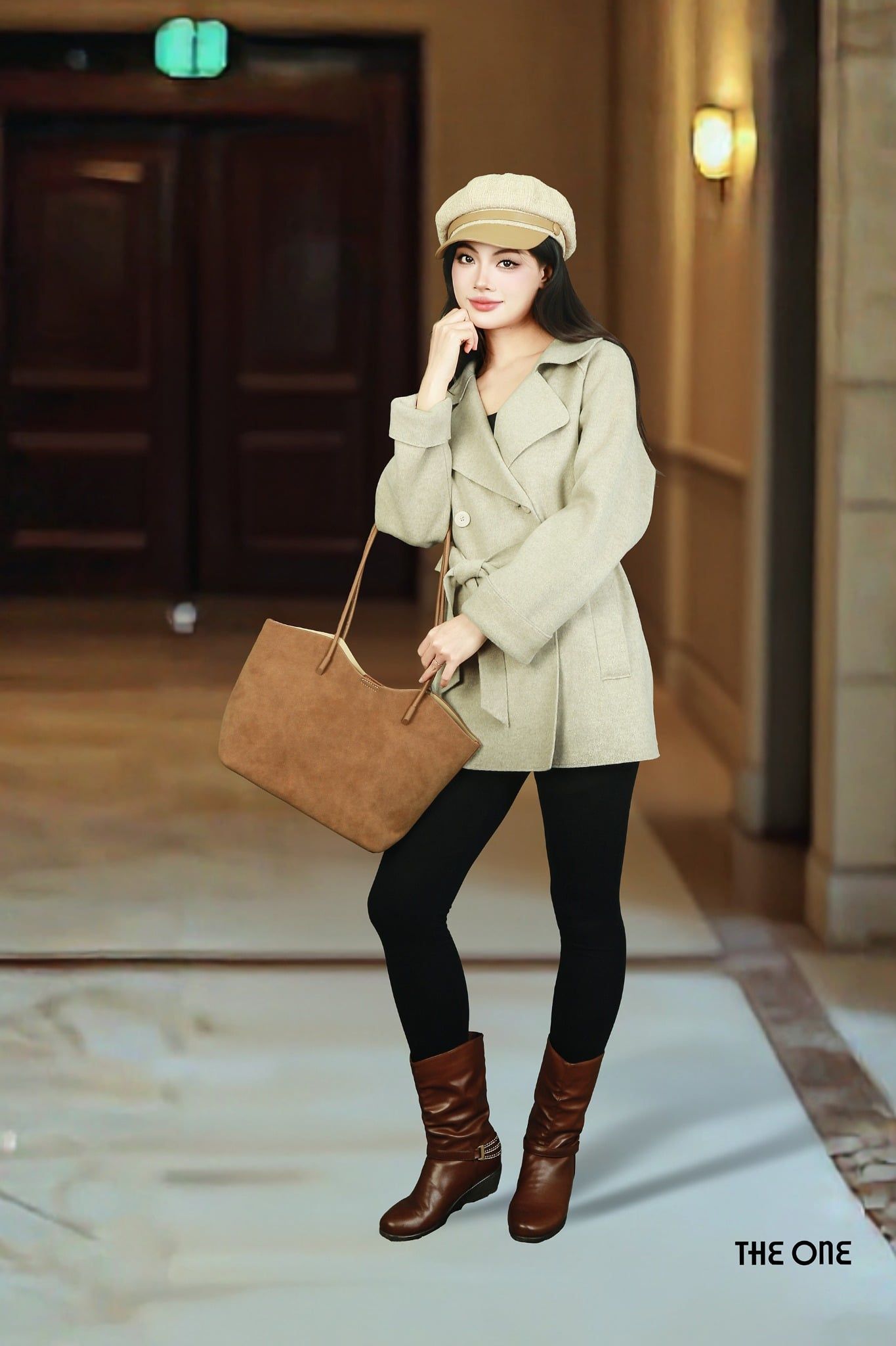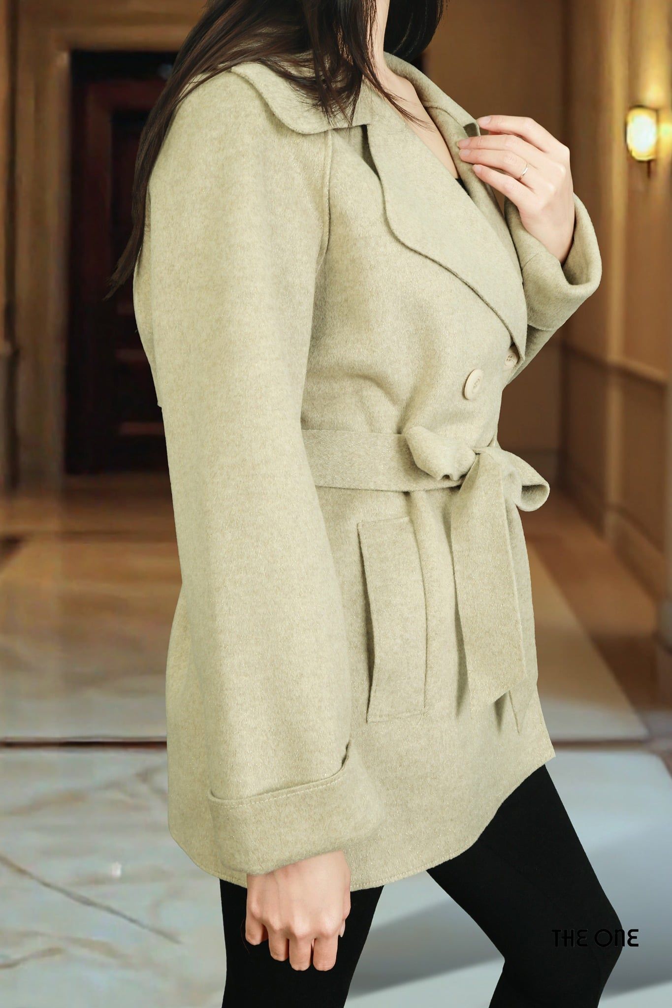 Áo măng tô dạ lông cừu 2 mặt be Freesize cổ B 4 khuy dây đai dáng ngắn đáp lưng