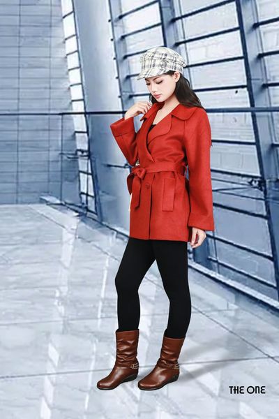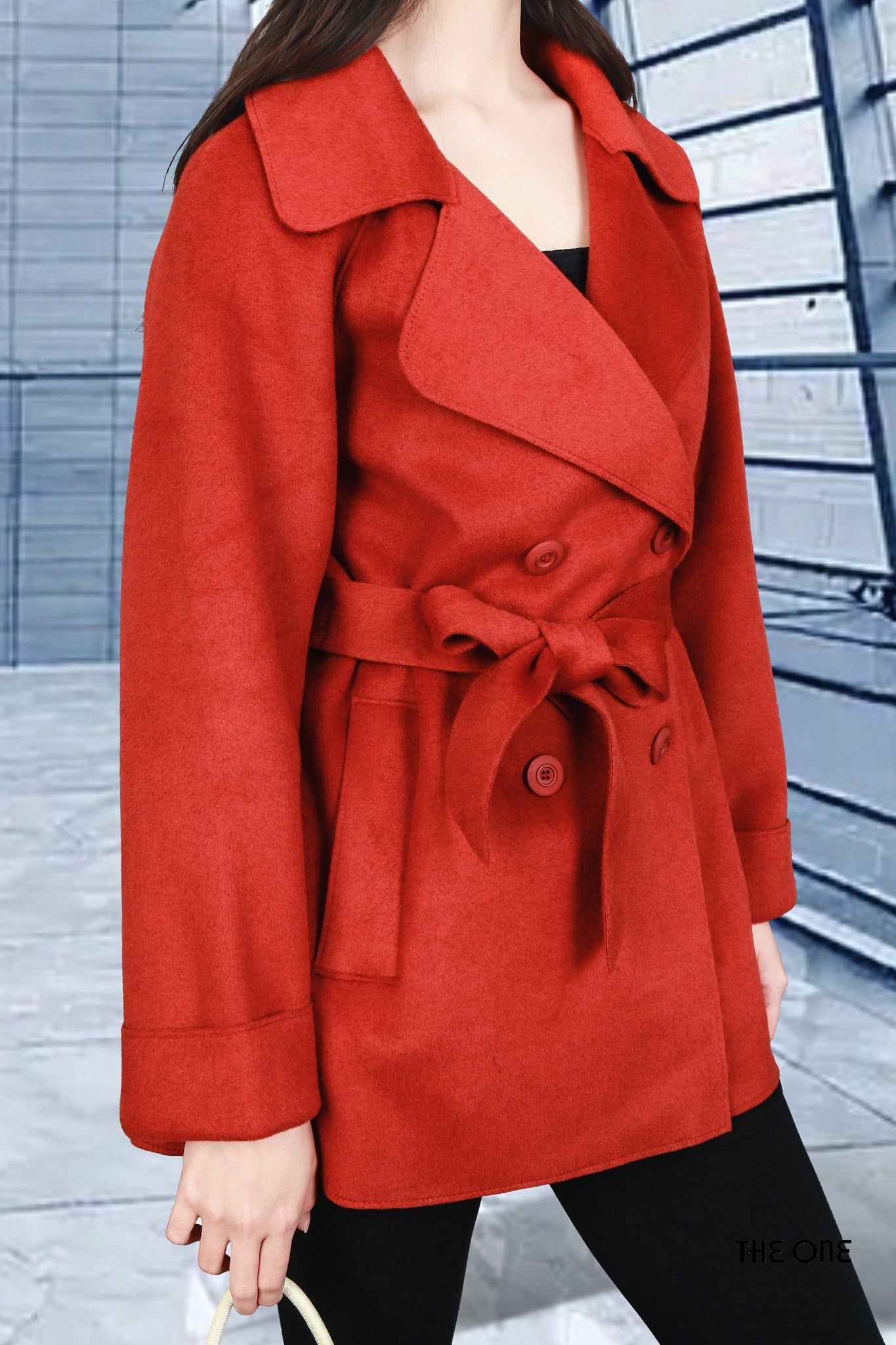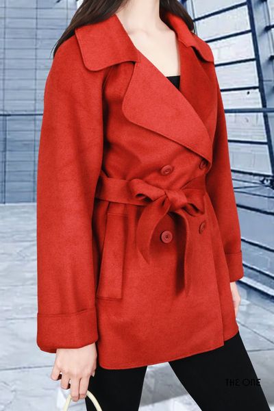 Áo măng tô dạ lông cừu 2 mặt đỏ cam Freesize cổ B 4 khuy dây đai dáng ngắn đáp lưng