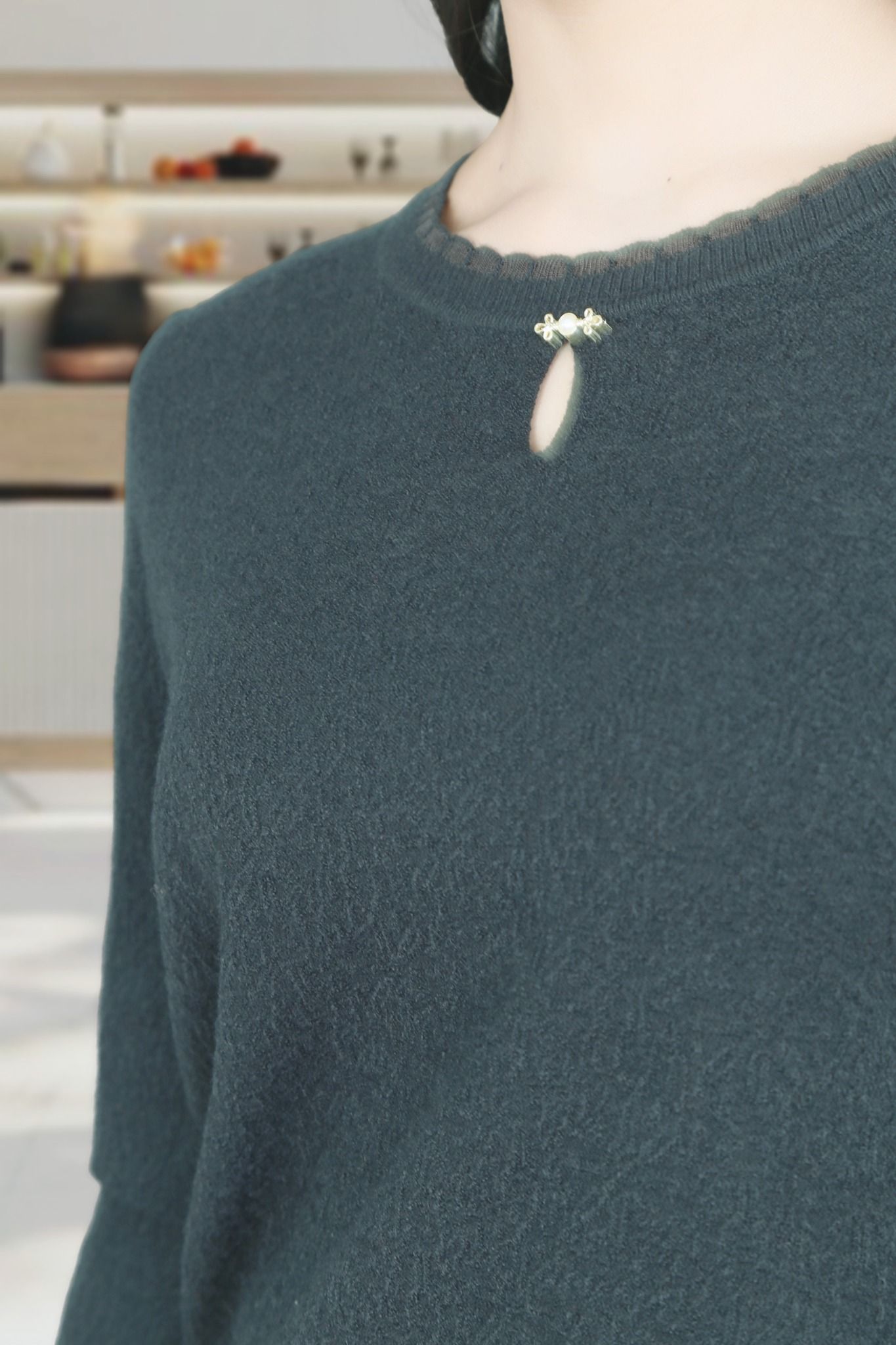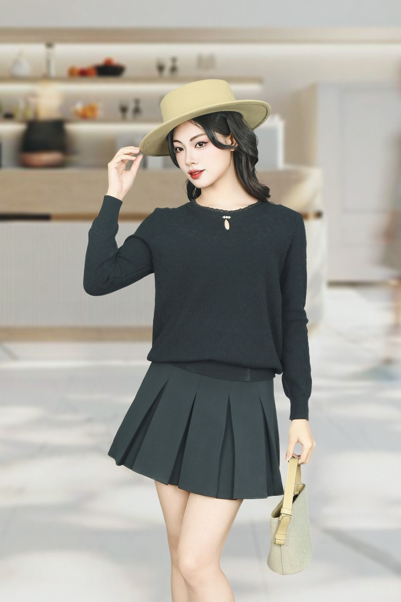 Áo len đen cổ tròn viền ren bo gấu tay dài giọt lệ đính khuy trang trí