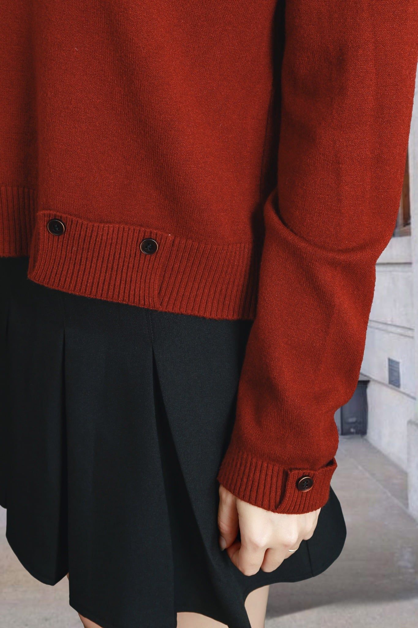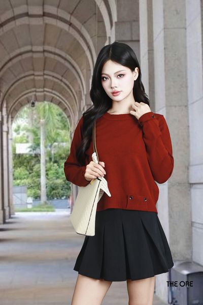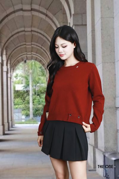 Áo len đỏ đậm cổ tròn tay dài khuy tay và gấu